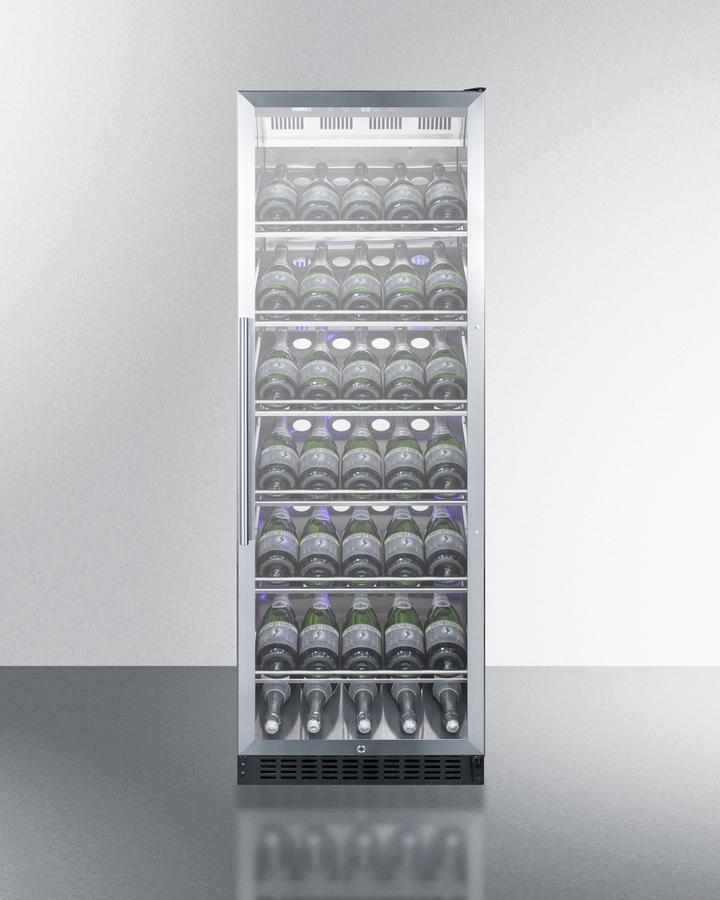 Summit Commercial offers a unique selection of wine cellars designed for optimum storage and bottle presentation. The SCR1401CHCSS is an upright wine cellar built to meet NSF-7 commercial standards. The slim 24 inch footprint takes up minimum floor space, while the large 12.6 cu.ft. The self-closing stainless steel trimmed door includes a pro style handle and factory-installed lock for added security. This unit has a front-breathing cooling system that allows built-in installation, and a fully finished exterior that also enables freestanding use. It comes with a right hand door swing. For a left hand version, see the SCR1401LHCHCSS. Inside, the SC1401CHCSS includes stainless steel shelving specially designed to hold champagne and sparkling wine bottles at a slight angle, providing a full display of the label. The interior walls and floor are constructed from stainless steel for lasting durability in busy commercial settings. This unit is illuminated through the rear walls with efficient LED lighting in a striking blue hue. The digital control panel offers a wide 36 to 68 F temperature range that allows you to program the optimum settings for red, white, or sparkling wine. Additional features include an audible high temperature alarm, open door alarm, temperature memory function, and sabbath mode setting. The SCR1401CHCSS comes with a fully wrapped stainless steel cabinet. Additional choices are available in stainless steel, as well as alternate sizes. Browse our website to explore our full lineup of commercially approved wine cellars.