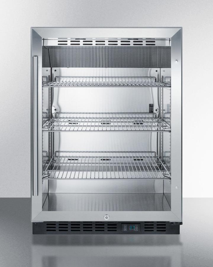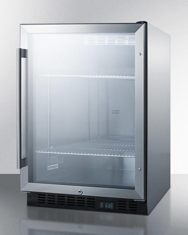 SUMMIT's commercial beverage centers offer an attractive display for products under reliable cold storage conditions. The SCR610BLCSS comes in an easy-fitting 24" footprint, with a front-breathing design that can be built-in under counters or used freestanding. The reversible double pane tempered glass door includes a professional handle and a factory installed lock, with stainless steel door trim to help highlight stored products. A digital thermostat is located in the kickplate for easy temperature management. This unit features a stainless steel wrapped cabinet. Inside, the SCR610BLCSS utilizes low maintenance automatic defrost operation with an internal fan to ensure even temperature distribution. Recessed LED lighting offers the perfect display conditions inside the durable and easy-to-clean stainless steel interior. Three cantilevered chrome shelves ensure flexible storage that accommodates any item size. High temperature and open door alarms offer added protection. The SCR610BLCSS is ETL-S listed to NSF-7 standards for use in commercial settings and is ENERGY STAR certified as a commercial refrigerator.