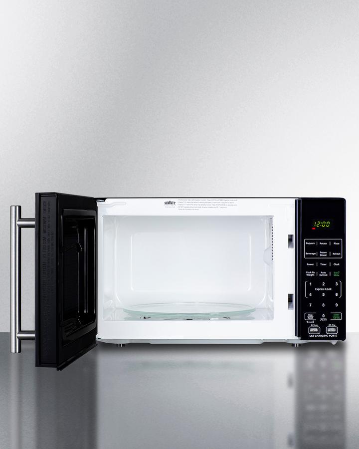 Summit's selection of microwave ovens includes fully featured models specially designed to maximize convenience in residential and hospitality settings. Model SM903BSA1 is a countertop microwave in a jet black finish, with a door window for convenient viewing and an easy-grab handle in brushed stainless steel. The rear features a built-in allocator that accepts a 2 or 3-prong plug, making this unit ideal for 1-cord use with a refrigerator, coffeemaker, or other appliance. The allocator automatically disables the second appliance when the microwave is in use, resuming power after the cycle is finished in order to prevent power surges. Two USB ports are built into the front to allow for charging of mobile devices. The digital control panel features one-touch settings for pizza, potatoes, popcorn beverages, frozen dinners, and reheating. Additional settings let you auto defrost, cook by weight, or add 30 seconds for fast reheating. Multi-stage cooking lets you combine different functions. The digital display can be disabled in eco mode and the end-of-cycle alerts muted at the touch of a button. This microwave features a clean white interior with a removable glass turntable. With its compact size and innovative power-saving design, the SM903BSA1 offers convenient benefits for a variety of locations.