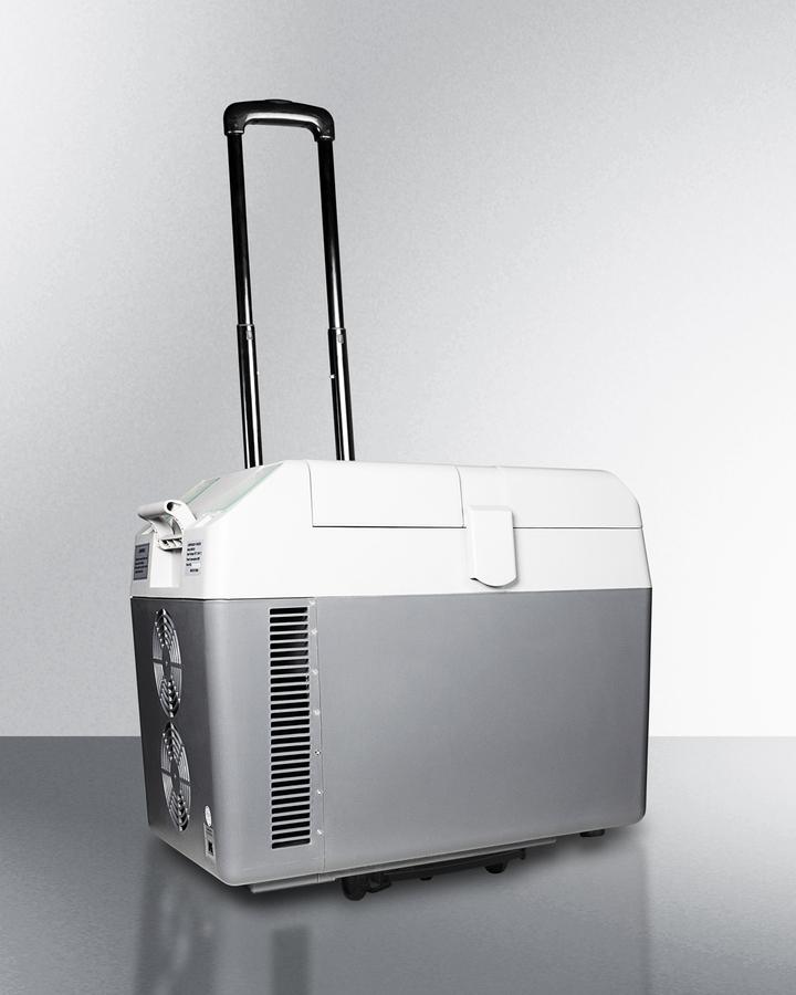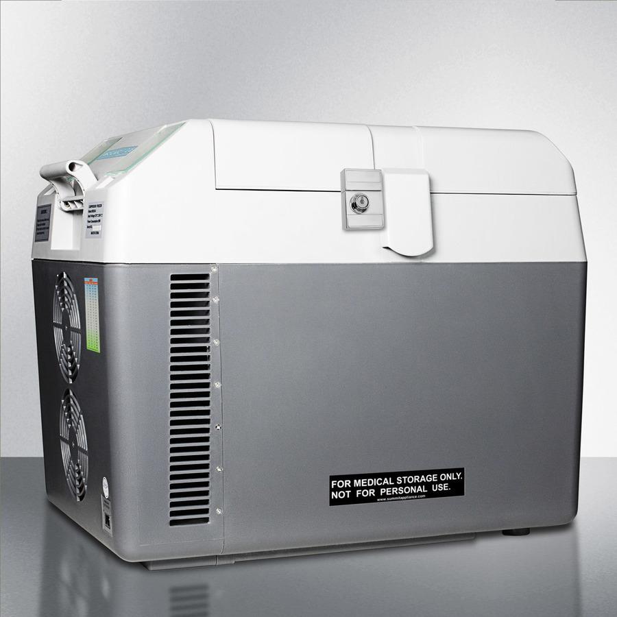 Accucold by Summit Appliance's SPRF26M is a portable 12V/24V refrigerator/freezer designed for reliable refrigeration on the go. This lightweight portable cooler is operated by a high quality compressor and can be plugged into the 12V DC lighter socket inside any vehicle or a 24V battery source. An AC adapter is included with the unit for alternate use in a 110V electrical wall outlet. The resilient gray plastic exterior is equipped with a specially installed keyed lock to protect contents and sturdy side handles for easy carrying. We include a separate cart trolley to make transporting the SPRF26M even more comfortable. The SPRF26M can be set at refrigerator or freezer temperatures with the capability to reach -15 C. A digital thermostat with an external LED thermometer display allows easy temperature control without requiring users to open the lid. Inside, the SPRF26M can hold up to 26 liters in a durable hammered aluminum interior. With a conveniently versatile design and reliable storage conditions, the SPRF26M is ideal for applications that require easy transportation of cold items, such as collecting samples or administering vaccines at an off-site location. Larger sizes are also available. NOTE: Accucold refrigerators are purpose-built to the support meeting the current CDC (Centers for Disease Control) guidelines for the storage of vaccines. At this time, Accucold refrigerators have not been evaluated to the new NSF 456 standard. For additional temperature assurance, the CDC recommends a calibrated digital data logger (DDL), which can be added with the purchase of a DLSA11CAL accessory.