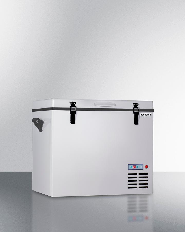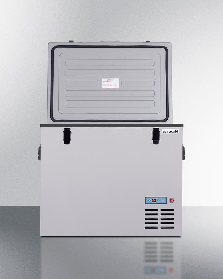 Summit Appliance brings advanced convenience to on-the-go refrigeration with the SPRF56, a fully featured portable cooler that can be set at refrigerator or freezer temperatures for use while camping, tailgating, roadtripping, and similar activities. This lightweight compressor-operated unit can be plugged into the 12V DC lighter socket inside any car, truck, RV, or boat, as well as 24V sources. We also include an AC adapter to allow the SPRF56 to be plugged into a 120V electrical wall outlet. It has a gray plastic exterior for added durability, while an insulated fabric cover is included to help preserve the cool interior and protect the exterior during transport. Handles are located on each side for easier lifting as needed. The SPRF56 can hold up to 55 liters with two compartments for convenient storage. The larger left compartment can serve as a refrigerator or freezer, with a hammered aluminum interior for added insulation. A wire basket is included for convenient transport of contents. The right compartment is non-refrigerated but when the larger compartment is running will reach temperatures between 40-55(degree)F, perfect for storing produce, bread, butter, and non-perishable items for added convenience. A digital thermostat with an external LED thermometer display allows easy temperature control without requiring users to open the lid. With a versatile design and reliable storage conditions, the SPRF56 brings new levels of convenience to portable cooling for users whether at home or on-the-go.