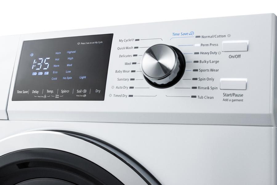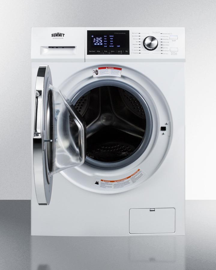 SUMMIT SPWD2202W is a 24" wide washer/dryer combo designed to maximize laundry capacity in an easy fit. This non-vented condensing (ductless) 115V washer/dryer comes in a classic white finish. The stainless steel drum offers a generous 2.7 cu.ft. capacity to accommodate larger laundry loads than previous versions of this unit. The front-loading design features a large, easy-to-open glass door and pull-out dispenser for detergent and fabric softener. A combination digital and dial control panel with a large LCD readout makes it easy and intuitive to operate this unit. The SPWD2202W includes 16 wash programs to ensure all fabrics receive the proper treatment. Settings include specialized programs for cotton, permanent press with de-wrinkling, heavy duty, bulky/large loads, sportswear, babywear, wool, delicates, and more.A "Sanitize" cycle allows the washer to use higher temperatures for smaller loads, while a "Quick" setting is ideal for washing small loads in less time. For improved maintenance, this combo includes a "tub clean" cycle. Five spin speeds up to 1300 RPM help to provide the right level of spin for each dry cycle. This unit offers the choice of four temperature settings and three soil levels, as well as a memory function ("My Cycle") for added convenience. With its quality performance, large capacity, and attractive design, the SPWD2202W brings true value and efficiency to laundry in space-challenged settings. NOTE: This unit replaces previous model SPWD2200W, and features an upgraded interior with a larger wash and dry capacity.