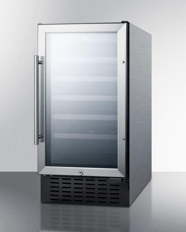 SUMMIT's collection of built-in undercounter wine cellars offers quality storage with user-friendly convenience and elegant style. Sized just under 18" wide, the SWC1840BCSS can be used built-in or freestanding. The user-reversible glass door features attractive stainless steel trim and a pro style handle, with a factory installed lock for added security. This unit comes with a wrapped stainless steel cabinet. Inside, this auto defrost wine cellar can store up to 34 Bordeaux or Burgundy style bottles, with a slotted floor that can also accommodate champagne if needed. The slide-out wooden shelves come in a jet black finish for a modern look. Recessed LED lighting offers an elegant view of the items, while the digital thermostat ensures easy temperature management. With its slim fit and convenient design, the SWC1840BCSS makes an attractive addition to any room. For a matching beverage center, see the SCR1841BCSS.