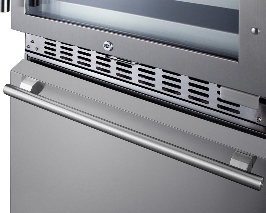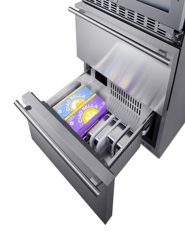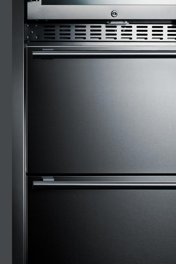 Summit brings an innovative, elegant solution to store wine and food with its combination two-zone wine cellar and two-drawer freezer - the perfect entertainment station for the home. Sized at just under 24" wide, the SWCDAF24 combines the 46 bottle capacity two-zone wine cellar (model ALWC532) with the 3.4 cu.ft. two-drawer freezer (model SCFF532D) into one complete refrigeration station. The front-breathing design allows built-in installation, while the stainless steel cabinet affords freestanding use in a durable design. Pro-style handles in brushed stainless steel complete the modern look, while the sealed back offers added space savings when placing the unit. The included 6' Y-shaped NEMA 5-15P cord with a 3-prong right angle plug allows users to operate both units from one outlet without added depth. For user convenience, this model ships fully assembled. The upper two-zone wine cellar has a user-reversible double-pane tempered glass door featuring a seamless stainless steel door for a modern look, while a factory-installed lock offers security as needed. Inside, automatic defrost operation ensures minimal user maintenance. It is designed to store up to 46 standard Bordeaux style bottles, or a combination of 30 Bordeaux and 16 wider Burgundy bottles. The digital control panel allows you to manage the upper-temperature zone between 41(degree)F and 50 F for white wine, while the lower zone is designed to store red wine between 50(degree)F and 64 F. Six full-extension black wire shelves with stainless steel front trim move out smoothly on ball-bearing glides for convenient loading. Both zones include recessed LED lighting in a gentle blue hue for an attractive and efficient presentation. The bottom two-drawer freezer features complete stainless steel construction inside and out for long-lasting durability in an easy-to-clean design. The digital thermostat makes it simple to manage the interior temperature. An internal fan ensures both drawers are evenly cooled. Two adjustable dividers allow you to separate the drawer compartments into two or four zones to accommodate a variety of sizes. A sliding chrome basket offers additional storage convenience as needed, while the LED lighting makes it easy to view interior contents when loading or unloading both drawers. Additional features include a high-temperature alarm and an open drawer alarm for added peace of mind. Sabbath Mode disables certain electrical features during periods of religious observance, while a temperature memory function helps to recover all settings in the event of power loss. Offering complete refrigeration convenience in a slim-fitting design, the SWCDAF24 is ideal for home bars, kitchens, and similar residential settings seeking to store wine, beverages, and food in a modern style. This unit can also be ordered to accept custom panels over the drawers and door frame (see model SWCDAF24PNR). Additional options are available with a bottom refrigerator (model SWCDAR24) or a bottom refrigerator-freezer (model SWCDRF24). Note: This unit comes with an anti-tip bracket which should be installed to prevent tipping forward.