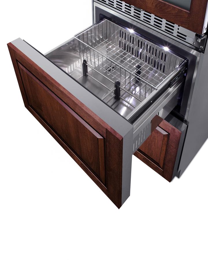 Summit brings an innovative, elegant solution to store wine and food with its combination two-zone wine cellar and two-drawer freezer - the perfect entertainment station for the home. Sized at just under 24" wide, the SWCDAF24PNR combines the 46 bottle capacity two-zone wine cellar (model ALWC532PNR)with the 3.4 cu.ft. two-drawer freezer (model SCFF532D) into one complete refrigeration station. The front-breathing design allows built-in installation, while the stainless steel cabinet affords freestanding use in a durable design. The sealed back offers added space savings when placing the unit, while the included 6' Y-shaped NEMA 5-15P cord with a 3-prong right angle plug allows users to operate both units from one outlet without added depth. The wine cellar door frame and freezer drawer fronts can be customized with overlay panels to match or accent an existing cabinetry design. Users provide their own handles to complete the look. An anti-tip bracket is included and recommended for use to avoid forward tipping. For user convenience, this model ships fully assembled. The upper two-zone wine cellar has a user-reversible double-pane tempered glass door featuring a seamless stainless steel door for a modern look, while a factory-installed lock offers security as needed. Inside, automatic defrost operation ensures minimal user maintenance. It is designed to store up to 46 standard Bordeaux style bottles, or a combination of 30 Bordeaux and 16 wider Burgundy bottles. The digital control panel allows you to manage the upper-temperature zone between 41(degree)F and 50 F for white wine, while the lower zone is designed to store red wine between 50(degree)F and 64 F. Six full-extension black wire shelves with stainless steel front trim move out smoothly on ball-bearing glides for convenient loading. Both zones include recessed LED lighting in a gentle blue hue for an attractive and efficient presentation. The bottom two-drawer freezer features complete stainless steel construction inside and out for long-lasting durability in an easy-to-clean design. The digital thermostat makes it simple to manage the interior temperature. An internal fan ensures both drawers are evenly cooled. Two adjustable dividers allow you to separate the drawer compartments into two or four zones to accommodate a variety of sizes. A sliding chrome basket offers additional storage convenience as needed, while the LED lighting makes it easy to view interior contents when loading or unloading both drawers. Additional features include a high-temperature alarm and an open drawer alarm for added peace of mind. Sabbath Mode disables certain electrical features during periods of religious observance, while a temperature memory function helps to recover all settings in the event of power loss. Offering complete refrigeration convenience in a slim-fitting design, the SWCDAF24PNR is ideal for home bars, kitchens, and similar residential settings seeking to store wine, beverages, and food in a modern style. Additional panel-ready options are available with a bottom refrigerator (model SWCDAR24PNR) or a bottom refrigerator-freezer (model SWCDRF24PNR). Note: Panels are not included. The images provided are meant only to be suggestive of what the product with wood panels installed could look like. Users must supply their own wood panels.