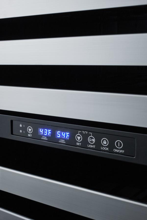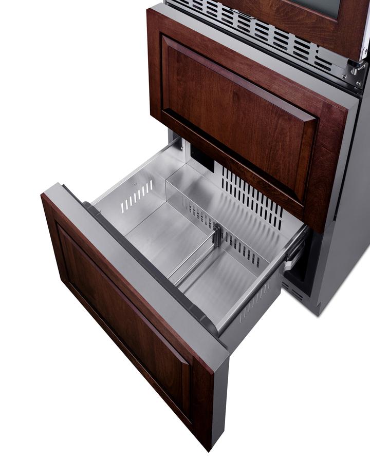 Summit brings an innovative, elegant solution to store wine, food, and beverages with its combination two-zone wine cellar and two-drawer refrigerator - the perfect entertainment station for the home. Sized at just under 24" wide, the SWCDAR24PNR combines the 46 bottle capacity two-zone wine cellar (model ALWC532)with the 3.4 cu.ft. two-drawer refrigerator (model FF642D) into one complete refrigeration station. The front-breathing design allows built-in installation, while the stainless steel cabinet affords freestanding use in a durable design. The sealed back offers added space savings when placing the unit, while the included 6' Y-shaped NEMA 5-15P cord with a 3-prong right angle plug allows users to operate both units from one outlet without added depth. The wine cellar door frame and refrigerator drawer fronts can be customized with overlay panels to match or accent an existing cabinetry design. Users provide their own handles to complete the look. An anti-tip bracket is included and recommended for use to avoid forward tipping. For user convenience, this model ships fully assembled. The upper two-zone wine cellar has a double pane tempered glass door featuring a seamless stainless steel trim, while a factory-installed lock offers security as needed. Inside, automatic defrost operation ensures minimal user maintenance. It is designed to store up to 46 standard Bordeaux style bottles, or a combination of 30 Bordeaux and 16 wider Burgundy bottles. The digital control panel allows you to manage the upper-temperature zone between 41(degree)F and 50 F for white wine, while the lower zone is designed to store red wine between 50(degree)F and 64 F. Six full-extension black wire shelves with stainless steel front trim move out smoothly on ball-bearing glides for convenient loading. Both zones include recessed LED lighting in a gentle blue hue for an attractive and efficient presentation. The bottom two-drawer refrigerator features complete stainless steel construction inside and out for long-lasting durability in an easy-to-clean design. The digital thermostat makes it simple to manage the interior temperature. An internal fan ensures both drawers are evenly cooled. Two adjustable dividers allow you to separate the drawer compartments into two or four zones to accommodate a variety of sizes, perfect for storing canned beverages or meats and cheeses to pair with your favorite wine. A sliding chrome basket offers additional storage convenience as needed, while the LED lighting makes it easy to view interior contents when loading or unloading both drawers. Additional features include a high-temperature alarm and an open drawer alarm for added peace of mind. Sabbath Mode disables certain electrical features during periods of religious observance, while a temperature memory function helps to recover all settings in the event of power loss. Offering complete refrigeration convenience in a slim-fitting design, the SWCDAR24PNR is ideal for home bars, kitchens, and similar residential settings seeking to store wine, beverages, and food in a modern style. Additional panel-ready options are available with a bottom freezer (model SWCDAF24PNR) or a bottom refrigerator-freezer (model SWCDRF24PNR). Note: Panels are not included. The images provided are meant only to be suggestive of what the product with wood panels installed could look like. Users must supply their own wood panels.