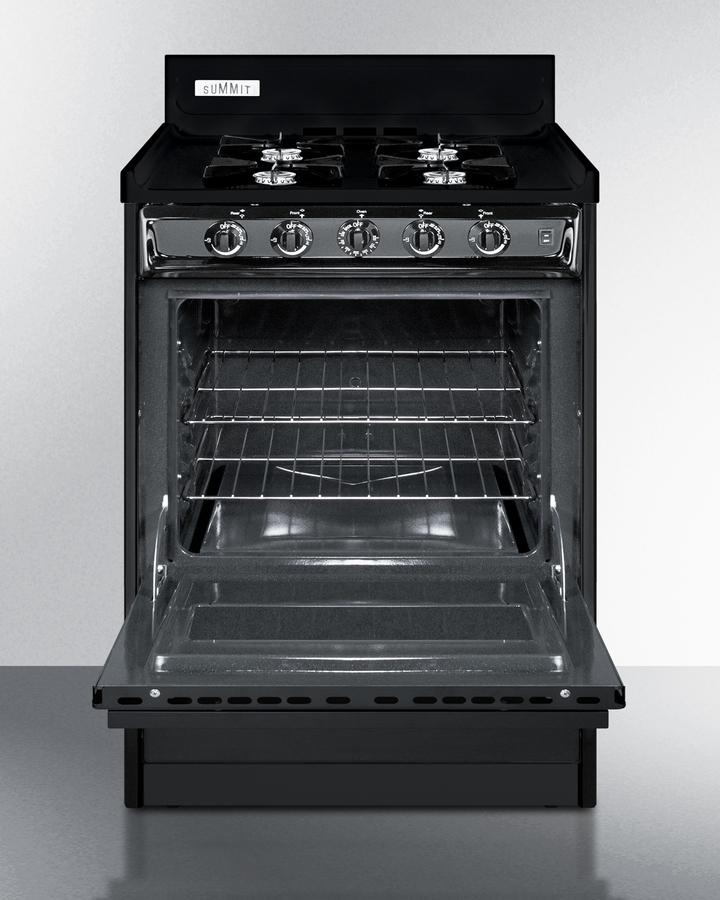 Summit Appliance offers a wide selection of American-made household ranges built for long-lasting durability in space-challenged kitchens. The TNM6107C is an apartment-sized gas range sized at just 24" wide, with a generous 2.92 cu.ft oven interior that can accommodate large trays. Two adjustable oven racks are included. The broiler is located below the oven in a drop-down compartment. Four open 9000 BTU gas burners accommodate most of your stovetop heating needs, with upfront push-to-turn knobs that let you adjust your cooking without reaching over hot burners. This unit utilizes an electronic ignition system for added safety. The TNM6107C comes in a jet black finish to suit any kitchen setting. This unit has a recessed oven door and is conveniently sized at just 24" deep for a better fit in galley in L-shaped kitchens, where every inch counts. Constructed from porcelain and steel, the TNM6107C offers lasting durability. We include an anti-tip bracket for added safety. With its classic style and quality construction, Summit's made in the USA cooking line offers reliable cooking for smaller homes. Additional choices are available in 20", 30", and 36" wide fits. This unit ships ready for natural gas connections. To use with propane, add the Kit LP.