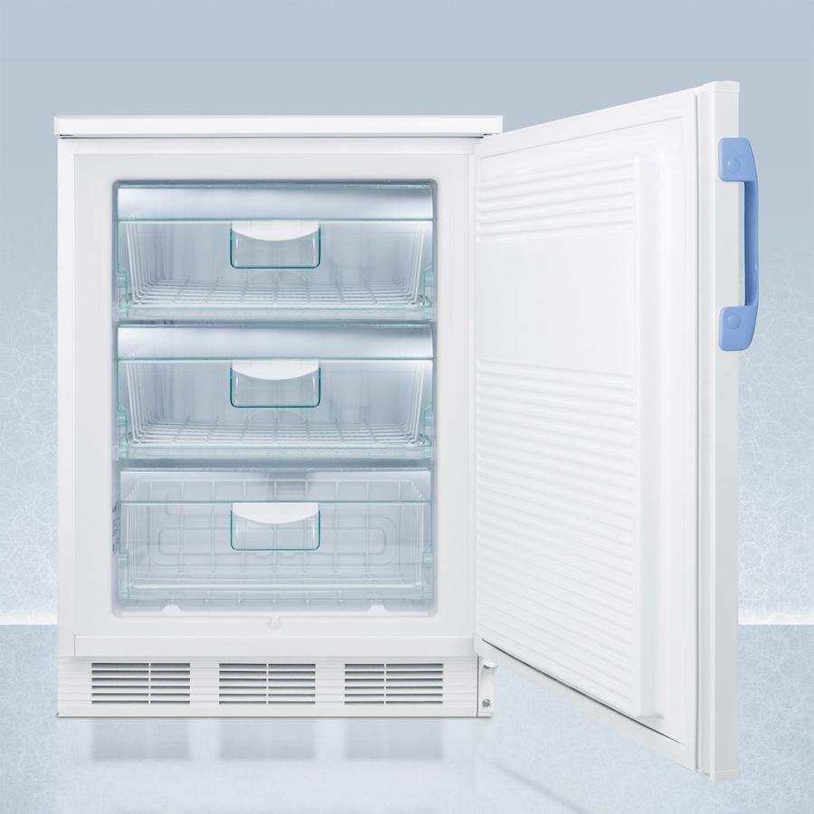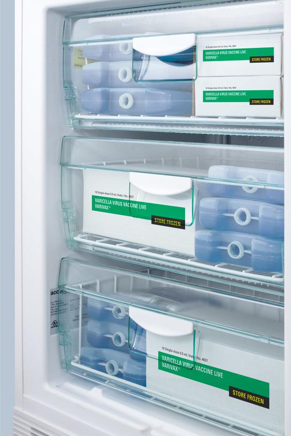 Accucold's MED2 series puts the most commonly requested features into a quality line of all-refrigerators and freezers specially designed to store vaccines and other sensitive materials in medical, scientific, pharmaceutical, and laboratory institutions. The VT65MLBIMED2 is an all-freezer sized in a convenient 24" footprint. The front breathing design allows built-in installation under counters, while the fully finished cabinet in white also enables freestanding use. This unit is designed with an external front control panel that allows users to adjust and monitor the temperature without opening the door or bending down to the floor. The front keyed lock is located towards the top of the door for added convenience. A hospital grade 'green dot' cord offers added safety in high traffic environments. As recommended by the CDC, VFC and VFA programs, the VT65MLBIMED2 is equipped with a NIST calibrated thermometer that displays the current, minimum, and maximum temperatures to the nearest tenth of a degree with a readout viewable in Celsius or Fahrenheit. Each VT65MLBIMED2 ships with a certificate of calibration for your records. The thermometer includes an audible alarm to warn users if the interior has gone out of the programmed temperature range. The buffered temperature probe is encased in a glycol-filled bottle to best simulate the temperature of other stored contents, resulting in the utmost accuracy for temperature reporting. We include a pre-installed 3/8" probe hole for users who wish to install additional monitoring equipment. The VT65MLBIMED2 features a 3.2 cu.ft. interior capacity and extra thick walls for reliable insulation. Slide-out baskets with clear plastic fronts allow users to view stored contents without exposing them to room temperature every time the door is opened. This low temperature freezer is designed to operate between -12 C to -25 C, an ideal temperature for certain vaccines, samples, and other sensitive medical materials. It has a flat door liner as recommended by the CDC. All MED2 series units are assembled in the USA from domestic and imported components. The VT65MLBIMED2 can be paired with a matching all-refrigerator (FF7LBIMED2) or ordered in a lower 32" height for use under lower ADA compliant counters (VT65MLBIMED2ADA). This unit can also be customized with additional features, including a self-closing door or USB temperature logger with a digital display. Contact our product specialists to learn more. Products in the MED2 series come with a two year warranty on parts and labor and a five year warranty on the compressor. *NOTE: This unit's thermostat is pre-set for Celsius. If you prefer Fahrenheit, add complimentary option DTMEDF or let your sales representative know upon order. NOTE: Accucold freezers are purpose-built to the support meeting the current CDC (Centers for Disease Control) guidelines for the storage of vaccines. As referenced in the current Vaccine Storage and Handling Toolkit, these units incorporate several key features for stable operation. For additional temperature assurance, the CDC recommends a calibrated digital data logger (DDL), which can be added with the factory-installed option DL2B or addition of the DL2BKit accessory. Select Accucold products have been tested and certified to the new NSF 456 standard, and are now available for purchase. For additional information, contact our products specialists.