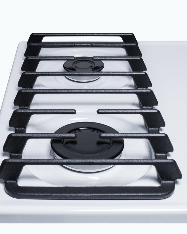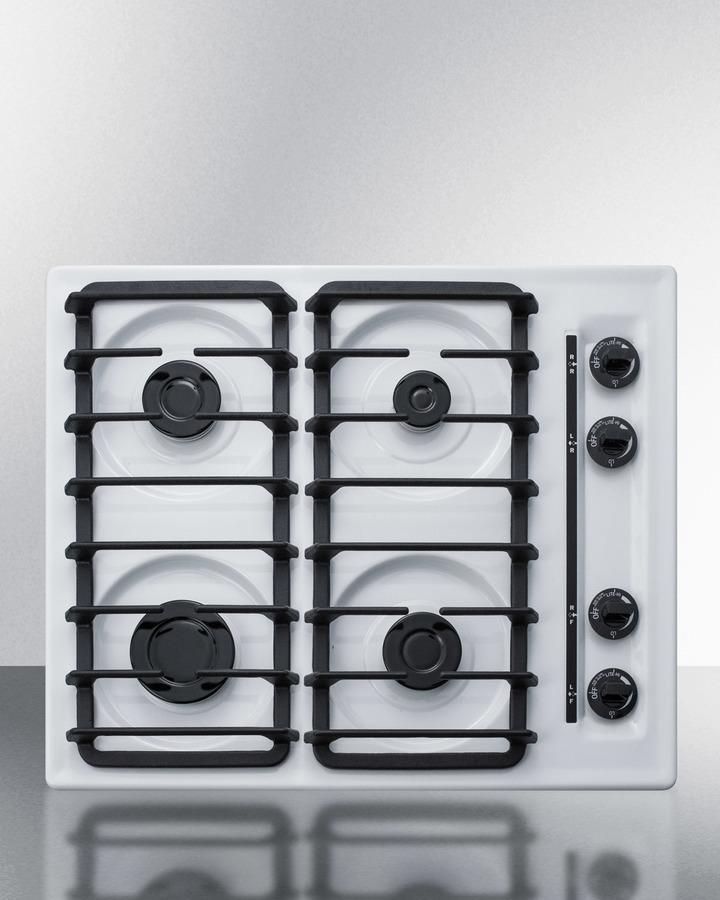 Made in the U.S.A., Summit's gas cooktops offer lasting quality and reliable cooking for smaller kitchen spaces. The WTL033S is a 24" wide 4-burner cooktop designed for 22 5/8" W x 18 5/8" D cutouts. The scratch-resistant porcelain surface features a classic white finish and recessed design to better contain spills. The side-located push-to-turn dial knobs offer easy use. Two sets of continuous cast iron grates are designed to hold up to heavy pots and pans. Four sealed Sabaf burners with removable burner caps ensure safer and cleaner cooking. The WTL033S includes a high output 12000 BTU burner for powerful heating, conveniently located in front for easy access. The rear 5000 BTU burner is ideal for simmering at lower power or keeping food warm without overcooking. Two standard 9100 BTU burners meet most cooking needs. This unit utilizes electronic spark ignition and includes a pre-installed 3-pronged cord. The WTL033S is set for natural gas and can be converted to propane connections with the purchase of our Kit LP S2. Additional choices are available in black and chrome.