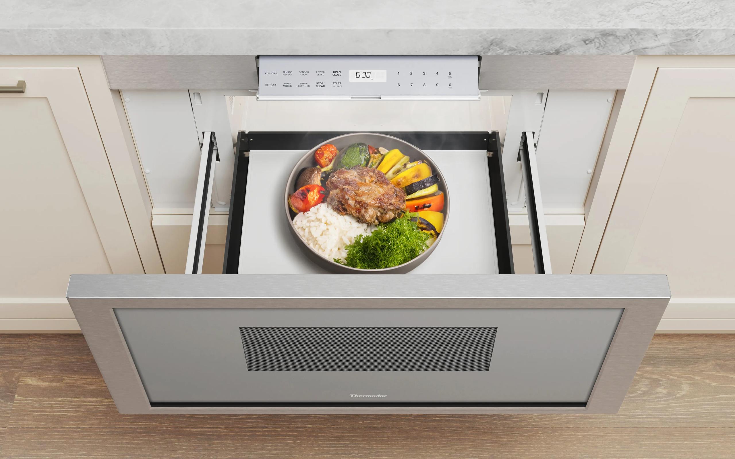 Incorporating a sleek, uncluttered design, the Built-In MicroDrawer(R) Microwave opens and closes with a simple touch, eliminating the need for a handle.