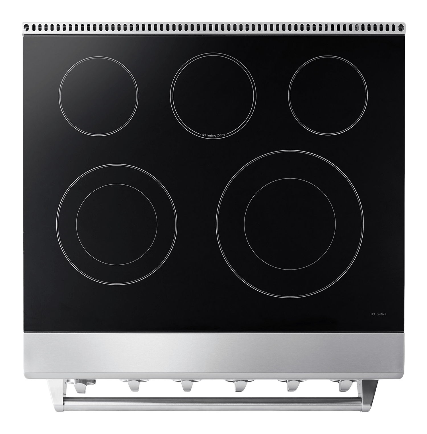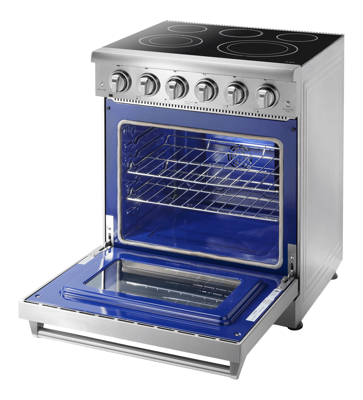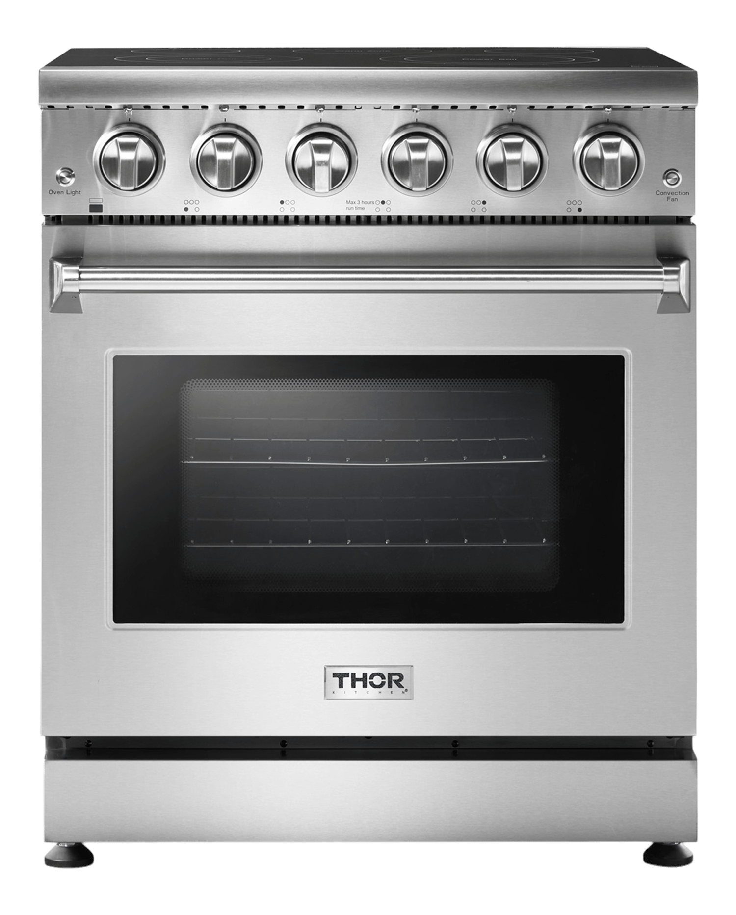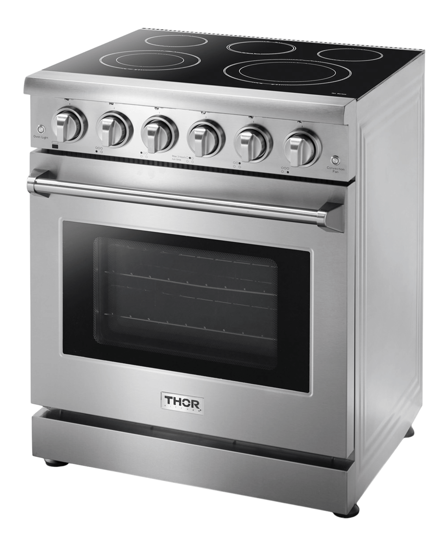 The THOR Kitchen 30 Inch Professional Electric Range is a stainless-steel machine that is designed with powerful features and functionality. This range features a smooth glass top that is easy to clean and five heating element zones that give you the ultimate cooking flexibility. From a 100W warming zone to a high-powered 3,000W LightningBoil(TM) Element, this range gives you the power to master any meal. #cooklikeagod