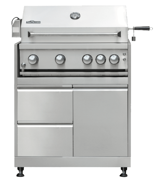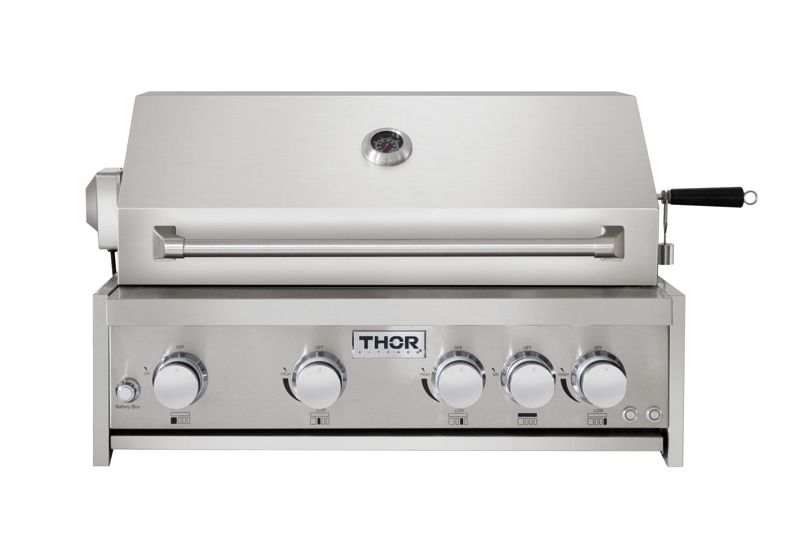 THOR Kitchen offers the power and performance of a premium pro-style appliance at a practical price. The THOR Kitchen 32 Inch 4-Burner Gas Grill is designed to sit on top of and connect to our 32 Inch Grill Cabinet (not included). This powerful grill has one 13,000 BTU infrared burner and three 12,000 BTU tube burners, giving you full control to create hot and cool areas on your que. It also features a 10,000 BTU rear infrared rotisserie burner, because rotating a bird keeps it juicy. The brilliant blue LED knob lights add a bold, stylish touch to your outdoor set up. #cooklikeagod