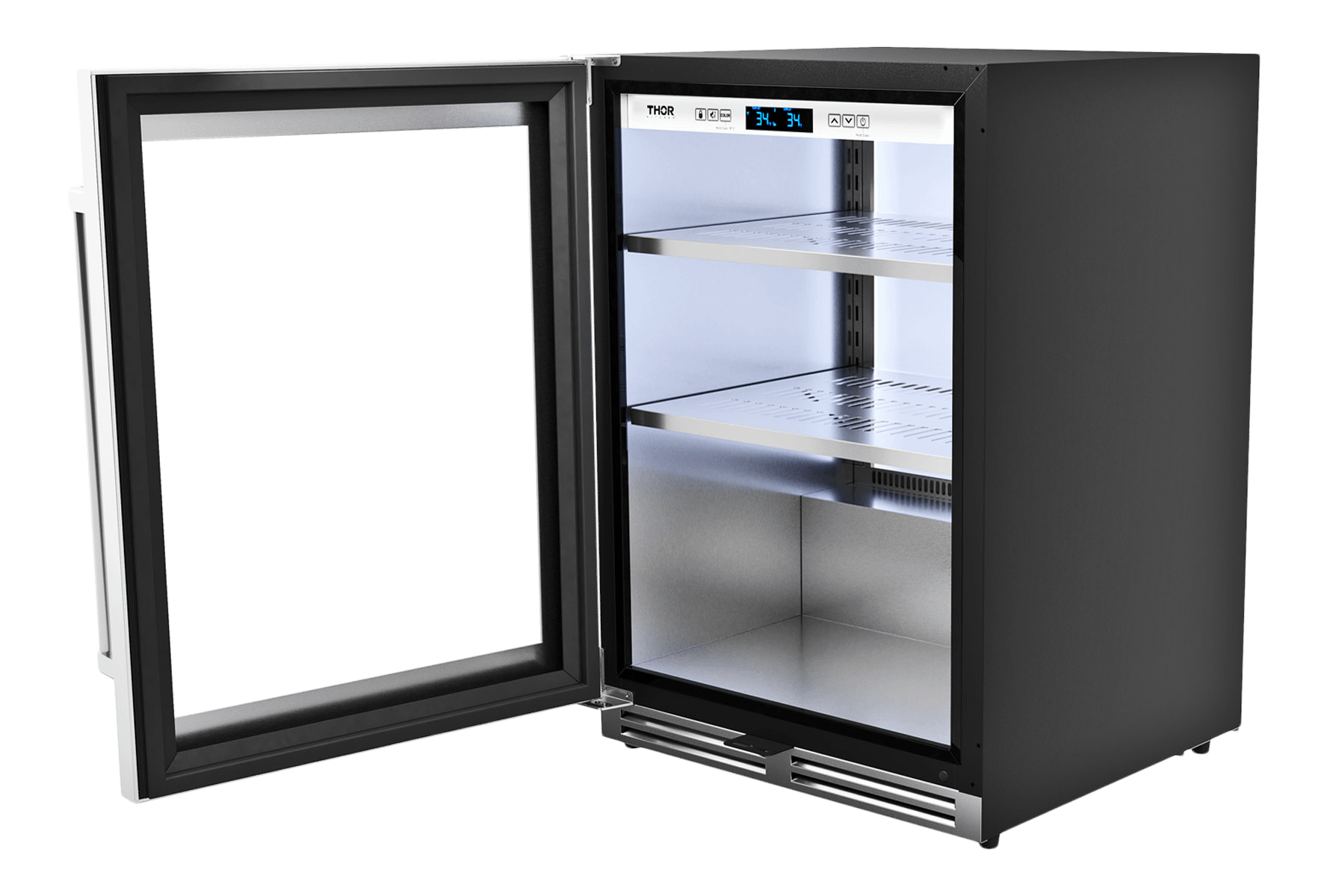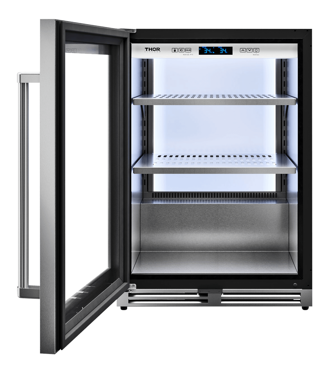 THOR Kitchen offers the power and performance of a premium professional appliance at a practical price. THOR Kitchen's 24-Inch Left Door Swing Undercounter beverage cooler is the perfect addition to any man cave. The sleek stainless-steel design and illuminating amber LED glow panel will create the ultimate chill experience as you unwind with your favorite beverage. The double-glazed triple pane glass panel even reduces transmission, so your drinks are perfectly chilled every time. The zero clearance hinges ensure that the cooler seamlessly integrates into your chosen location without any clearance concerns, maximizing your space utilization. #cooklikeagod