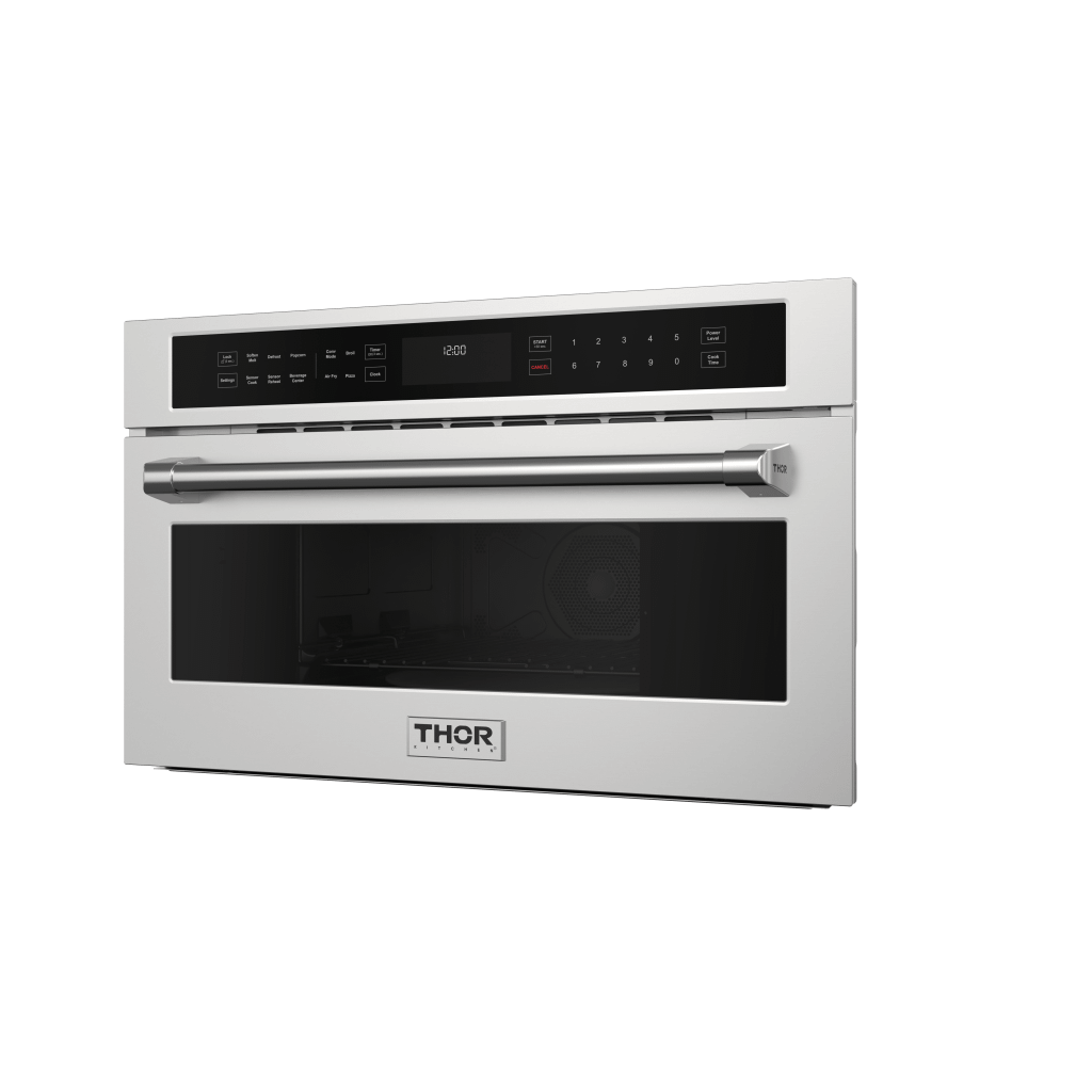 THOR Kitchen offers the power and performance of a premium professional appliance at a practical price. The 30-Inch Built-In Air Fry Microwave Oven with Drop-Down Door TMO30H combines air frying, broiling, convection baking, and sensor cooking in one sleek unit. Its 1.6 cu. ft. capacity fits family-sized dishes, while the touch LCD display makes cooking intuitive and easy. Features like Sabbath Mode, a control panel lock, and True Convection offer both versatility and peace of mind.