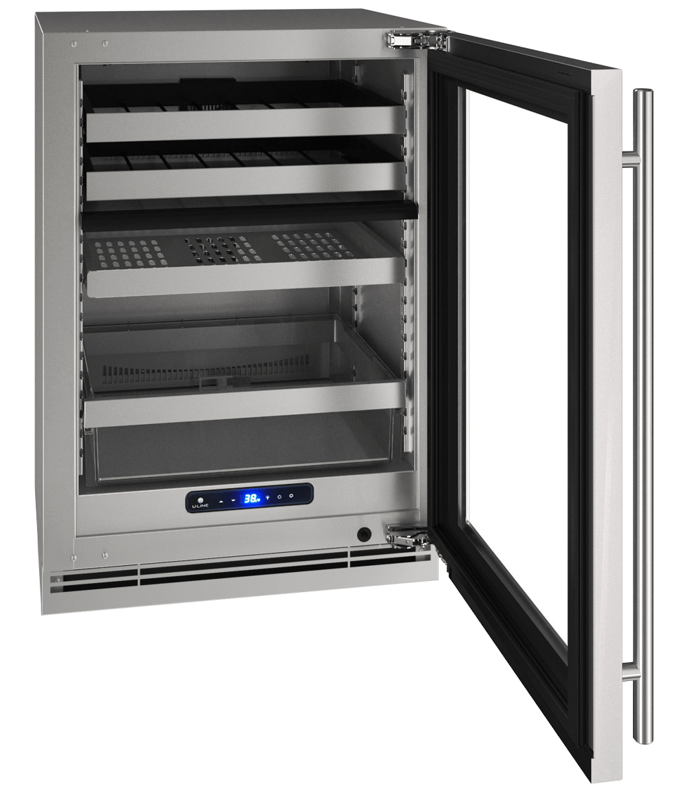 A favorite of cocktail enthusiasts, wine lovers, and beer drinkers alike, our 24" 5 Class Slide & Secure(TM) Dual-Zone Beverage Center is the ultimate home bar companion. This product features stainless steel inside and out, convection cooling for quick and consistent temperatures, and a state-of-the-art variable speed compressor. Robust and refined, U-Line's 5 Class Collection features an industry-exclusive full-depth lower interior allowing you to maximize storage space, adjustable blue and white LED lighting, and U-Adjust(TM) 17 position adjustment for full extension wine racks, Slide & Secure(TM) robust bins, and stainless steel sliding shelf. to contain and protect. This model can be built-in or used freestanding and is available with stainless steel or integrated door finishes that accept a custom door panel to match your surrounding cabinetry.