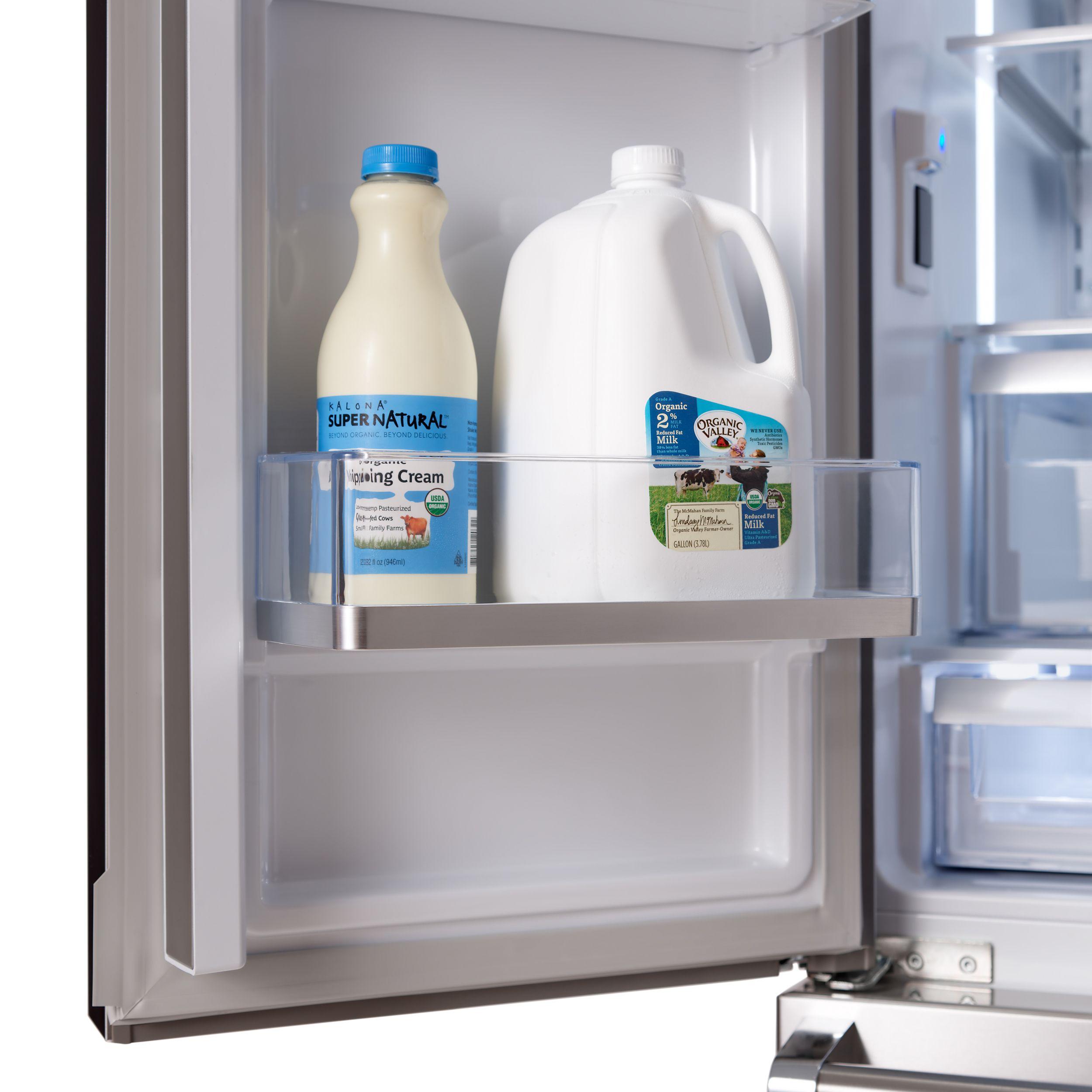 Two gallon door bins store milk, soda, and tea