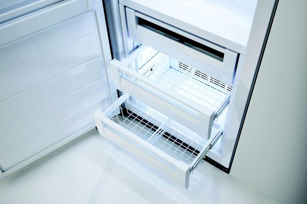 - Factory-installed automatic ice maker with full-width large-capacity ice drawer includes two separate ice pans for maximum ice production and storage