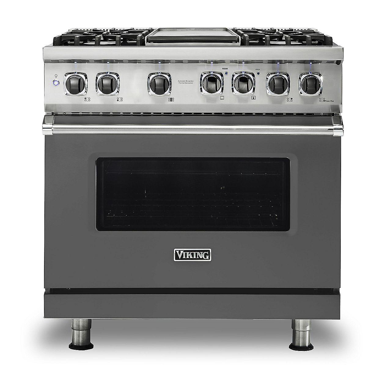 The Viking VDR5364GDG delivers pro-grade cooking with a sleek Damascus Gray exterior and powerful dual‑fuel engineering. Equipped with four sealed burners including a dedicated 12″ griddle, all featuring the exclusive VSH™ Pro Sealed Burner System and VariSimmer™ control, it offers precise flame adjustment and high heat performance up to 15,000 BTU. The spacious 5.6 cu ft convection oven incorporates a bi‑directional Vari‑Speed Dual Flow™ fan, hidden bake element, GourmetGlo™ infrared broiler, TruGlide™ racks, GentleClose™ door, and Rapid Ready™ preheat. With a self‑clean cycle, porcelainized cooktop with continuous cast-iron grates, SureSpark™ automatic re‑ignition, SoftLit™ LED knobs, and commercial-quality build, this range elevates both style and functionality in any kitchen.