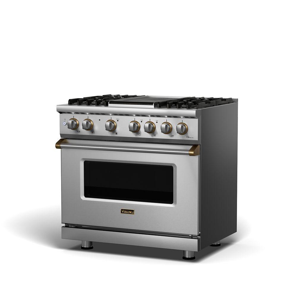 The brand Viking VDR5366BAN is a vibrant 36‑inch dual fuel range in Autumn finish, offering six sealed burners with VariSimmer™, spacious dual convection-capable ovens with self-clean, continuous grates, halogen lighting, hidden bake elements, and SureSpark™ ignition—combining reliability with bold color.