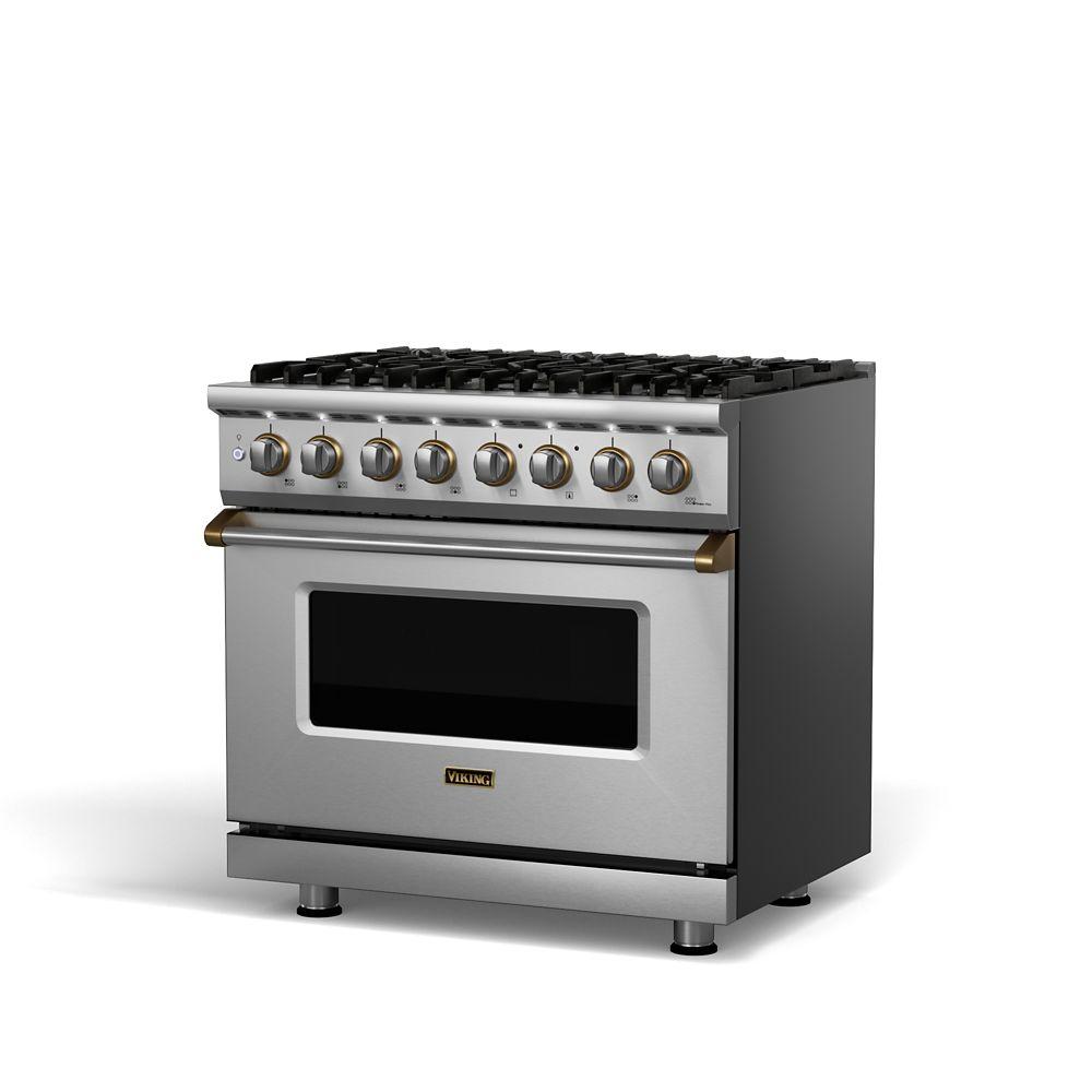 The brand Viking VDR5366BSS is a top-tier 36‑inch dual fuel range in elegant Stainless Steel. It features six VariSimmer™ sealed burners, dual ProFlow™ convection ovens with self-clean cycles, continuous cast-iron grates, halogen oven lighting, hidden bake elements, SureSpark ignition, and LP/NG conversion kit—built for serious cooking in any kitchen aesthetic.