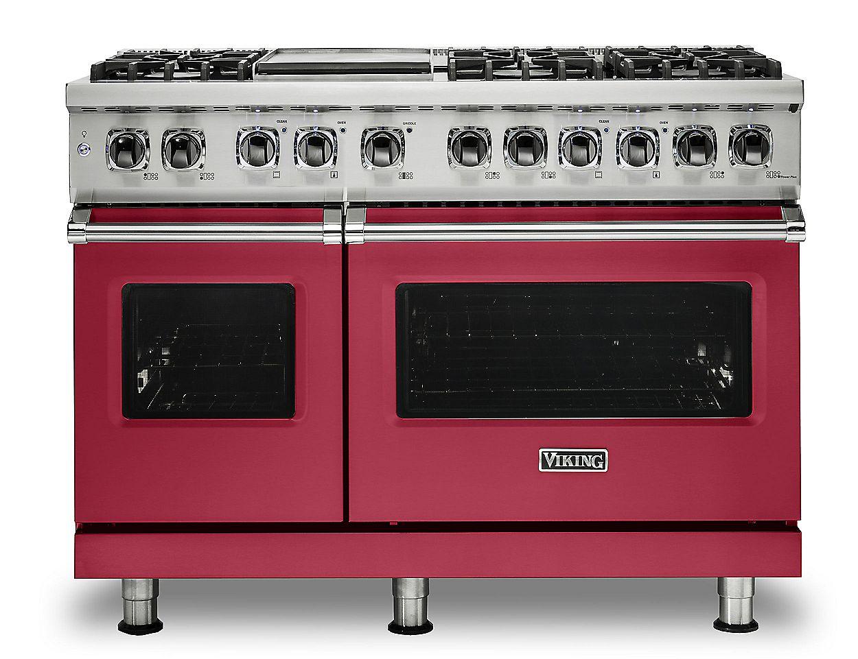 The brand + SKU: Viking VDR5486GVALP is a bold and refined 48‑inch freestanding professional dual fuel range in a vibrant Valentine finish, built for liquid propane and designed to deliver top-tier performance. It features six Elevation™ sealed burners that offer precision control, along with an integrated steel griddle for versatile cooking. The spacious 5.1 cu ft oven uses Precision Convection™ technology for uniform results across baking and roasting. Dual Gourmet‑Glo™ infrared broilers provide intense searing, while TruGlide™ full-extension oven racks and GentleClose™ doors enhance ease of use. With continuous cast-iron grates and SureSpark™ ignition, this range combines professional-grade performance with standout design for the most discerning home chefs.