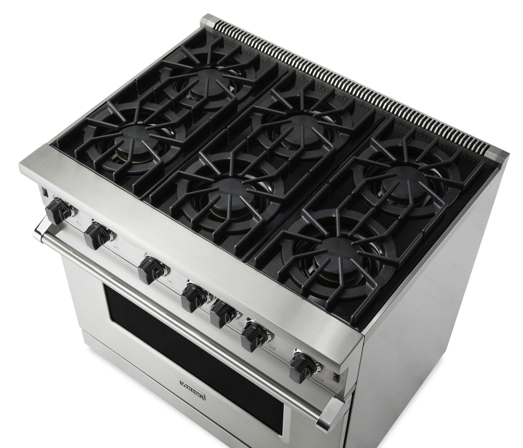• Heavy-duty, porcelainized, cast-iron removable surface grates provide continuous front-to-rear, left-to-right surface for easy movement of large pots