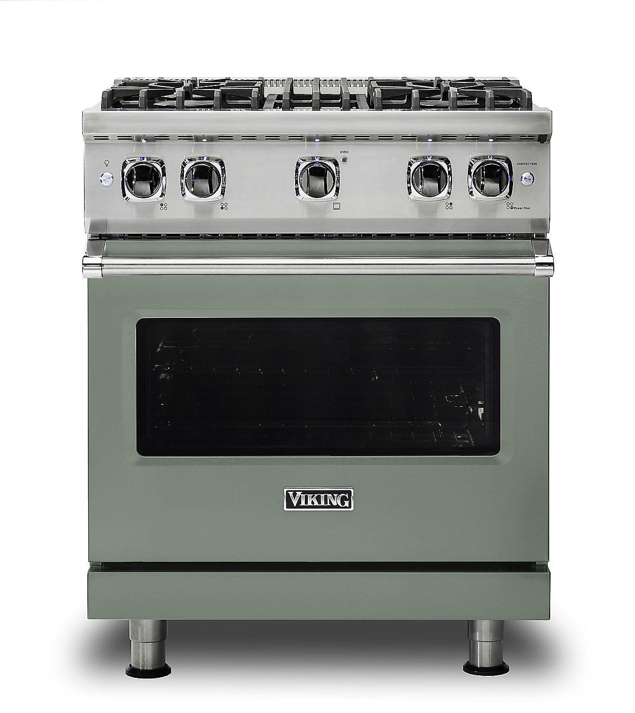 30-inch freestanding gas range in Eucalyptus finish, featuring four sealed burners, 4.0 cu ft convection oven, and infrared broiler — for pro-level performance.