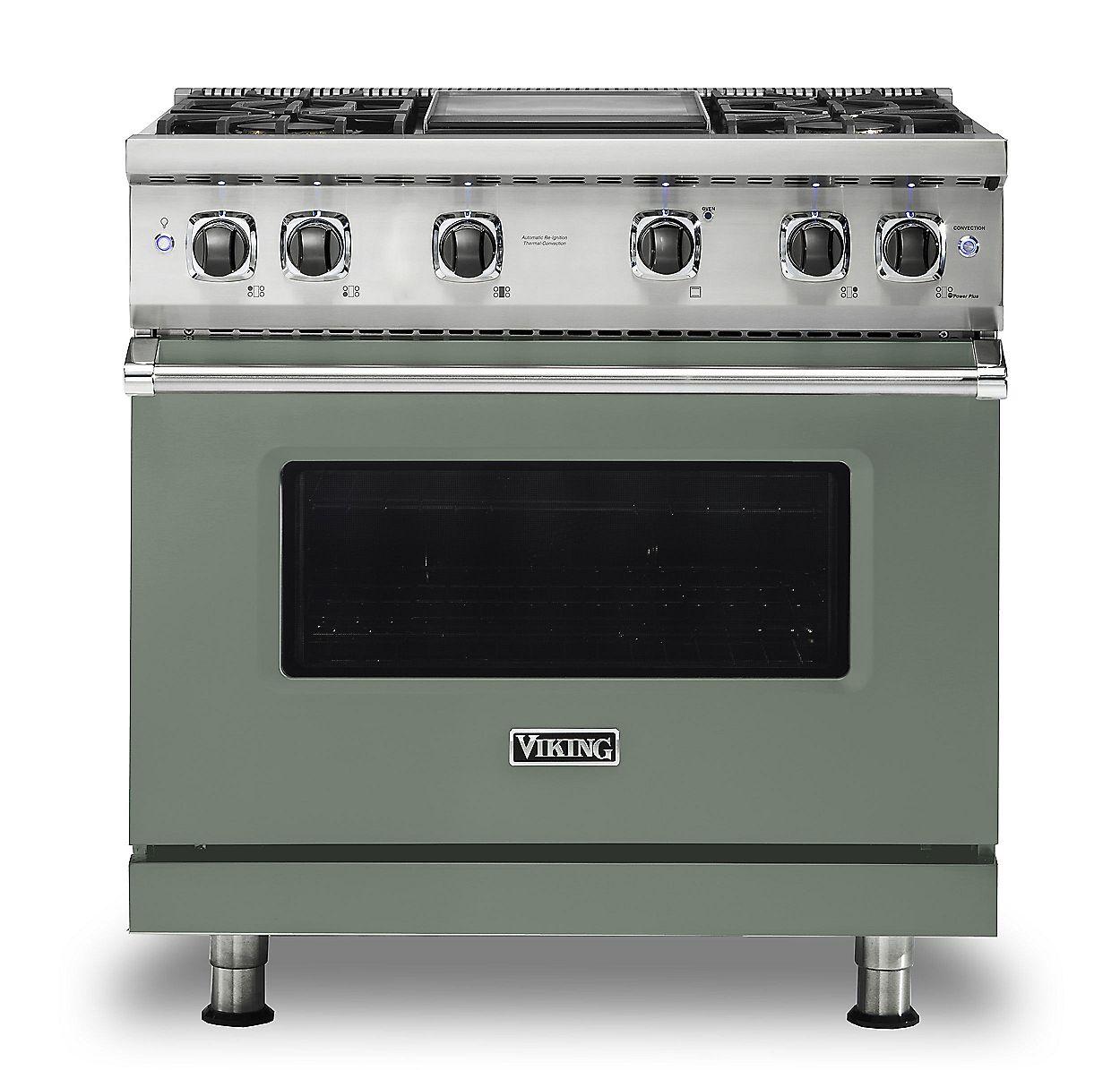 The Viking VGR5364GEULP brings commercial-grade performance to your kitchen with a 36 Inch freestanding design powered by Liquid Propane. This range features 4 VSH™ Pro Sealed Burners including the powerful 18,500 BTU TruPowerPlus™ Burner for rapid boiling and high-heat searing, along with a dedicated griddle for versatile cooking. Its 5.1 cu. ft. convection oven uses the ProFlow™ Convection Baffle to ensure even heat distribution, delivering consistent results for baking and roasting. Finished in elegant Eucalyptus, the range includes continuous cast-iron grates, automatic ignition/re-ignition via the SureSpark™ system, and a porcelainized surface for easy cleanup. Designed for the serious home chef, this range combines powerful performance with exceptional craftsmanship.