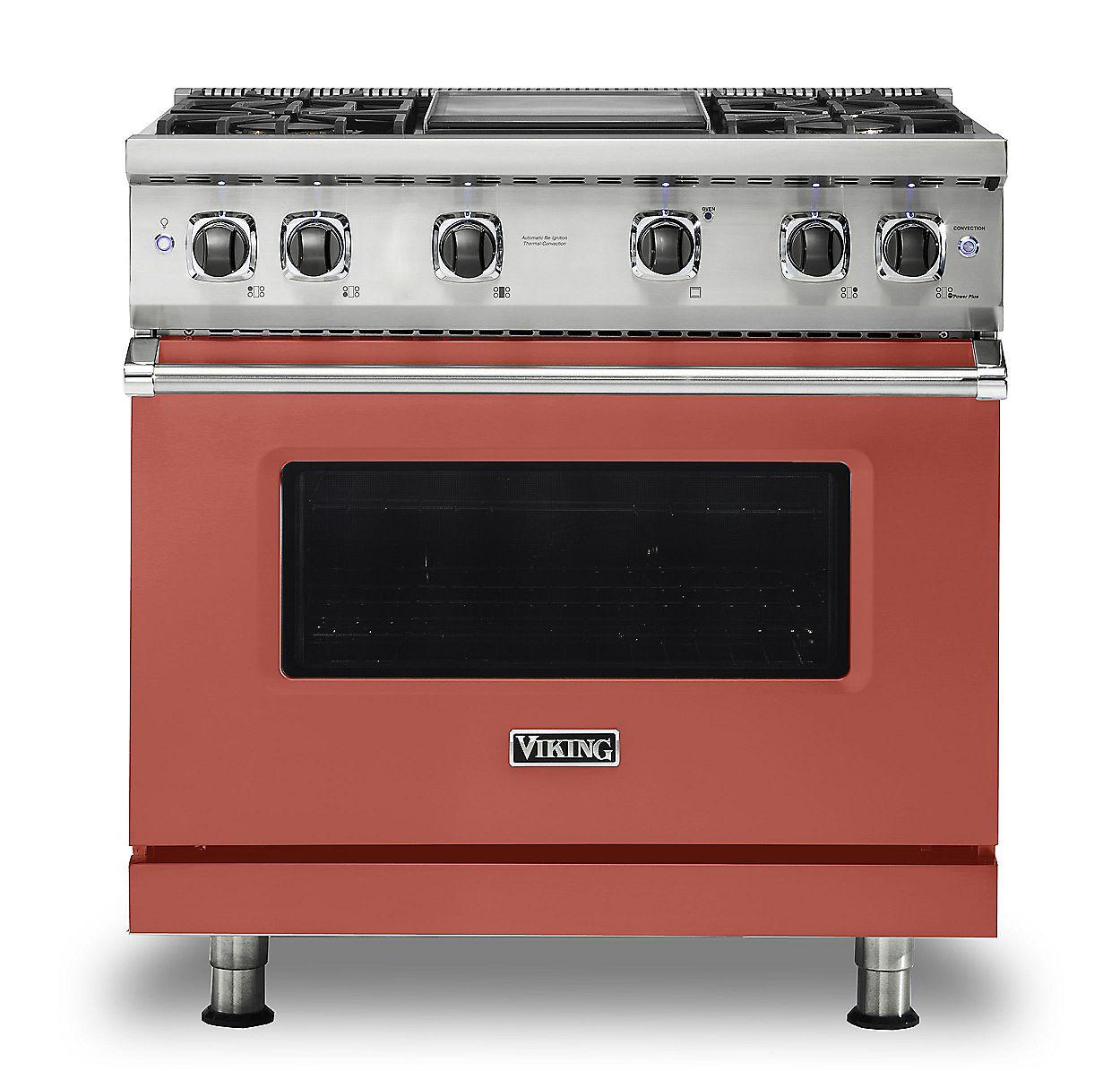 The brand Viking VGR5364GSCLP is a 36-inch pro-style gas range delivering exceptional power in a compact footprint. It includes four open burners—two 22,000 BTU high-output burners and two simmer burners—for flexible stovetop cooking. The optional 12-inch griddle/grill accessory transforms the cooktop for pancakes or searing. Beneath, the 5.1 cu ft convection oven with TruConvec™ airflow, 30,000 BTU U-shaped burner, and Gourmet‑Glo™ broiler ensures even and fast cooking. With continuous cast-iron grates, SureSpark™ ignition, TruGlide™ heavy-duty racks, GentleClose™ door, and SoftLit™ LED knobs, this range offers pro-grade results in a kitchen-friendly size.