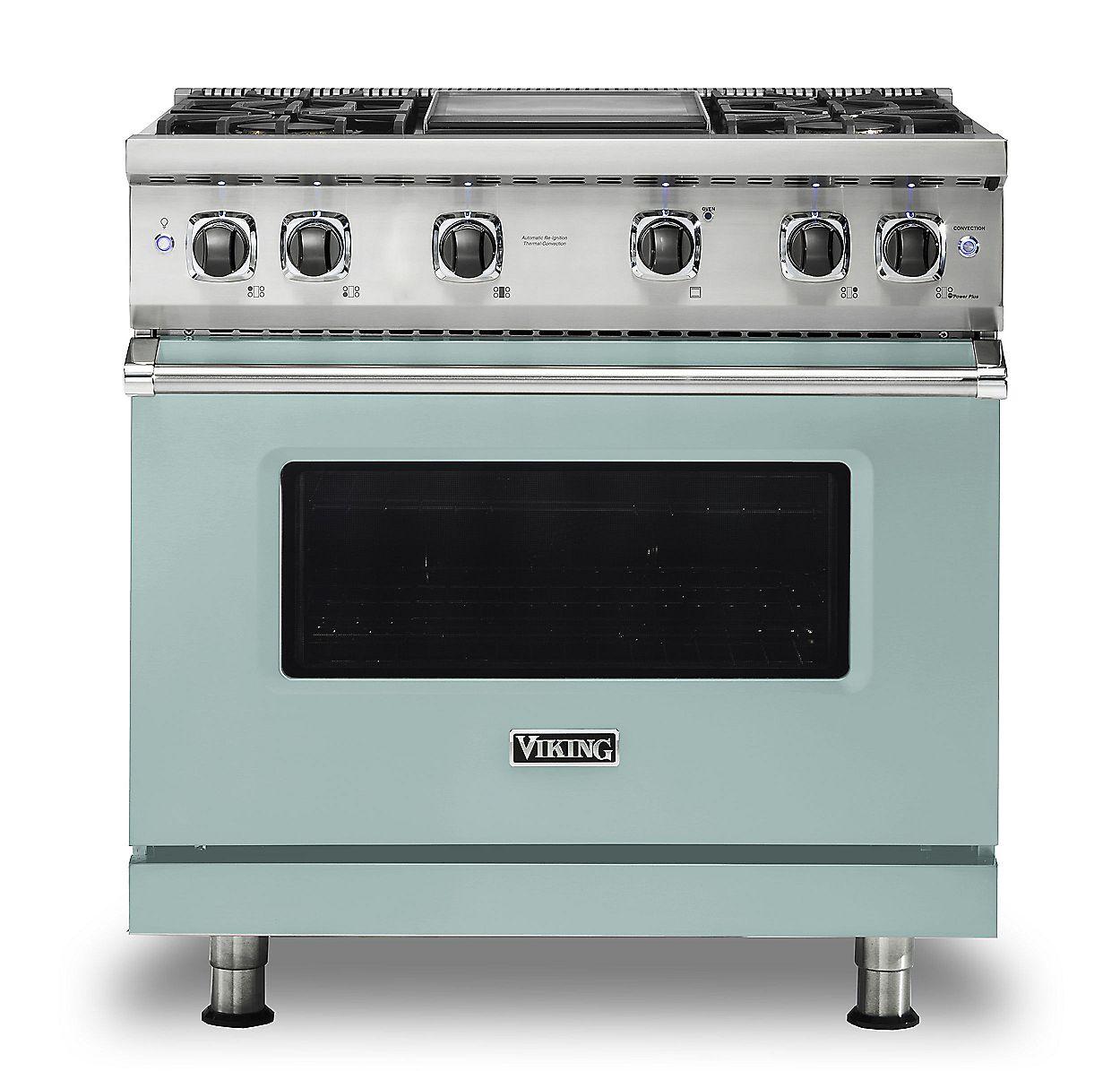 The Viking VGR5364GSPLP brings bold color and culinary performance together in this 36-inch freestanding gas range from the Viking 5 Series. Finished in a distinctive Light Blue, this professional-style range delivers both style and substance. The cooktop features four 15,000 BTU sealed burners and a 15,000 BTU thermostatic griddle that offers precise control for a variety of cooking tasks. The ProFlow™ convection oven ensures even heat distribution, while the Gourmet-Glo™ infrared broiler provides intense heat for fast, flavorful broiling. Designed for durability and convenience, the range includes continuous cast-iron grates, automatic electric spark ignition, precision control knobs, and a porcelain oven interior for easy cleaning. This range is ideal for home chefs seeking standout design and top-tier performance.