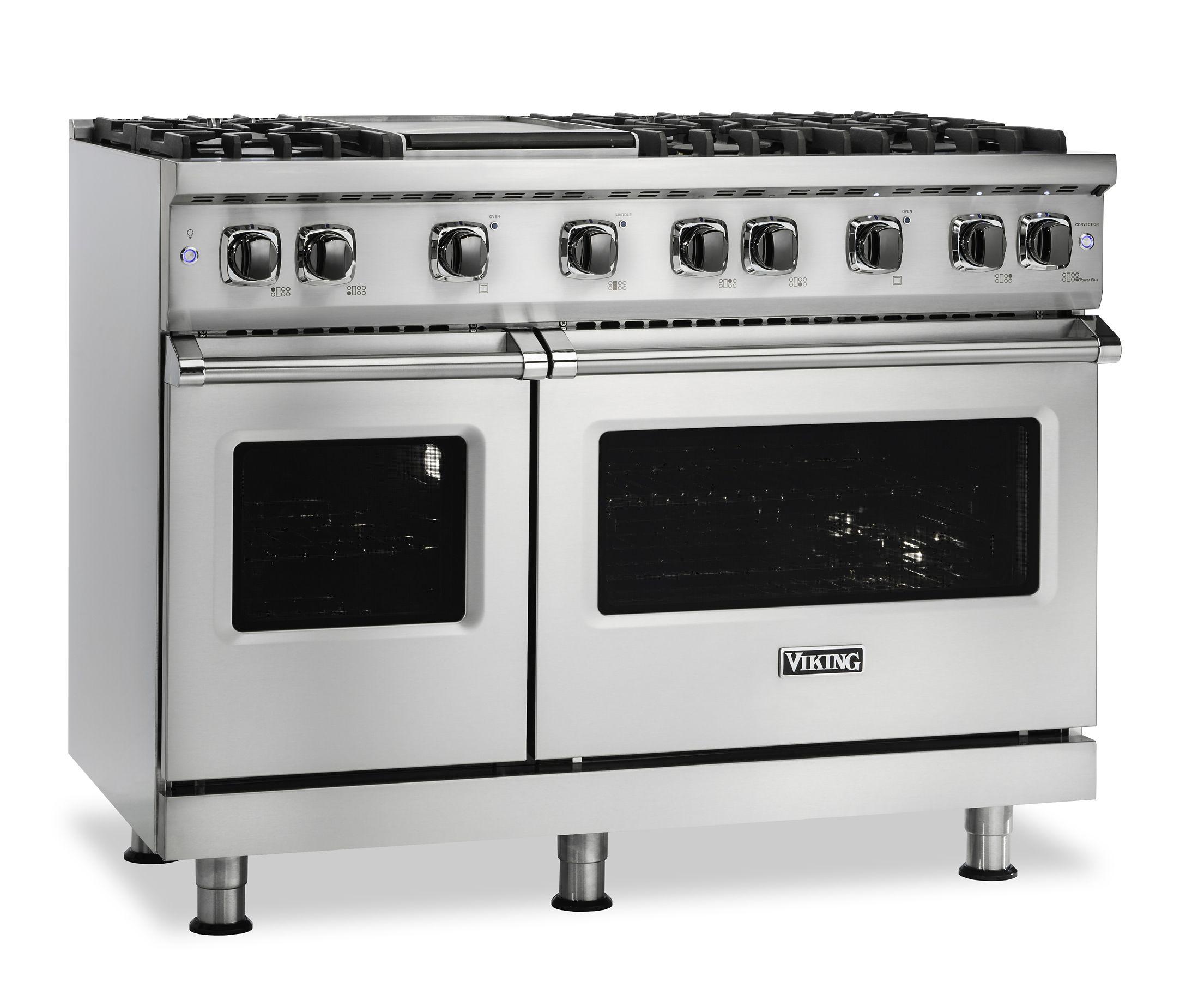 The Viking VGR5486GCS 48 Inch Freestanding Professional Gas Range in Cast Black offers a powerful and versatile cooking solution designed for culinary enthusiasts. Powered by natural gas, it features 6 sealed burners with the innovative VSH™ Pro Sealed Burner System for fast, even heat distribution and easy cleanup. A built-in griddle adds cooking flexibility, while the TruPowerPlus™ burner delivers up to 18,500 BTUs for intense searing and boiling. The ProFlow™ Convection Baffle ensures optimal airflow and even heat in the double oven, which provides a total of 6.1 cu. ft. capacity. With continuous grates for effortless pan movement and a professional-grade build, this range is ideal for high-performance kitchens seeking both power and style.