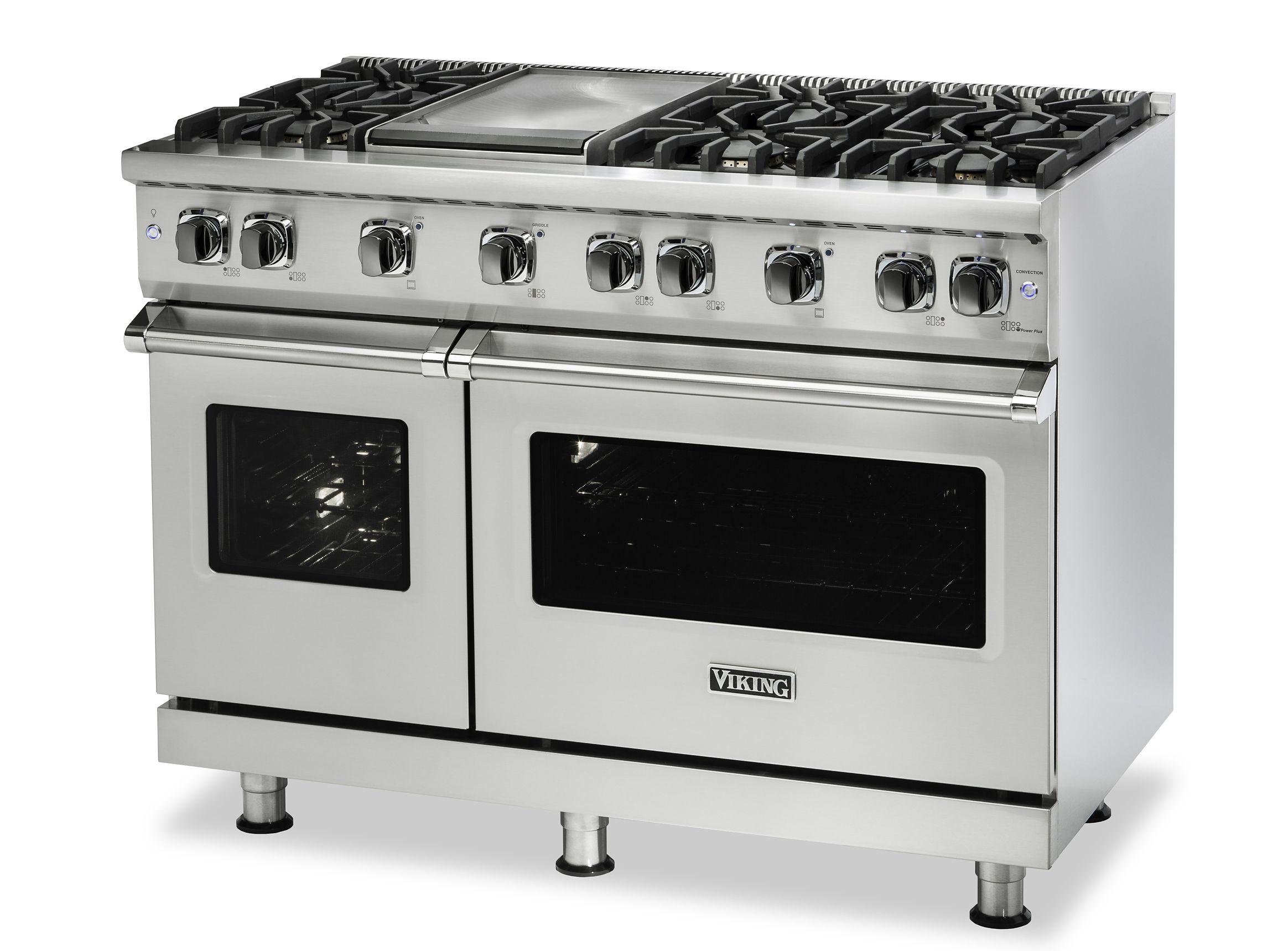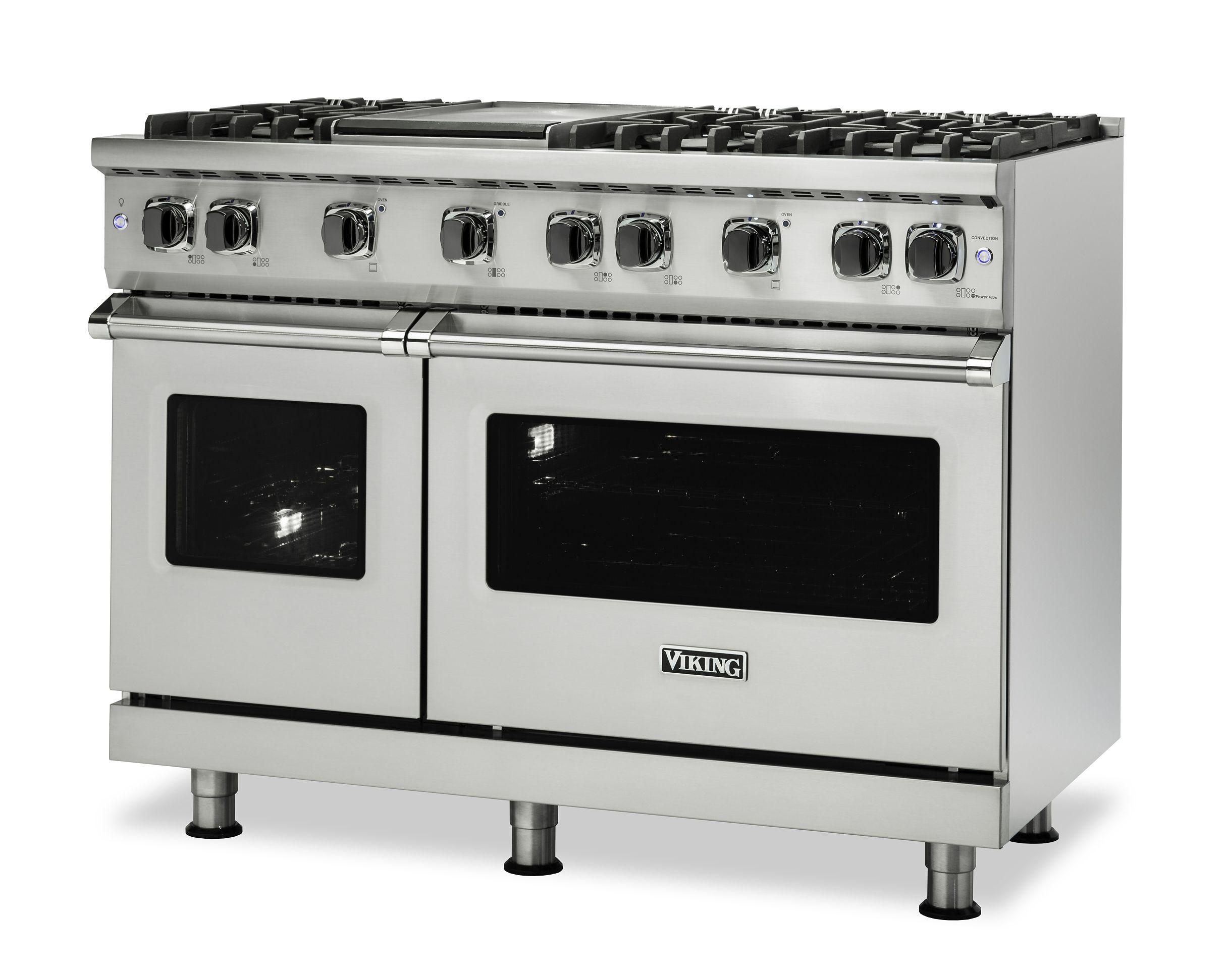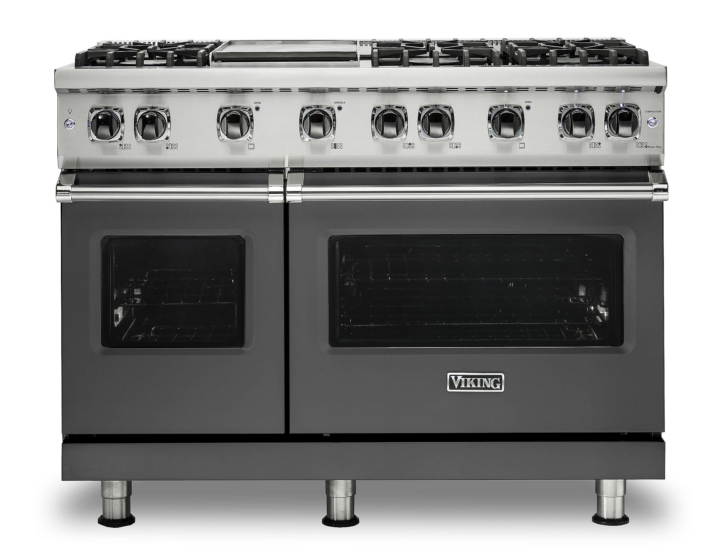 The Viking VGR5486GDG 48 Inch Freestanding Professional Gas Range in Damascus Grey is built for serious culinary performance and striking kitchen aesthetics. It features 6 VSH™ Pro Sealed Burners that deliver up to 18,500 BTUs for intense heat and precision simmering, paired with a thermostatically controlled griddle ideal for versatile surface cooking. The range includes a double oven configuration with a combined 6.1 cu. ft. total capacity, enhanced by the ProFlow™ Convection Baffle system for even heat distribution and perfect baking results. The TruPowerPlus™ burner adds a boost of power for demanding tasks, while continuous cast iron grates allow seamless movement of cookware. Finished in a rich Damascus Grey, this professional-grade range combines advanced features with timeless Viking durability and style.