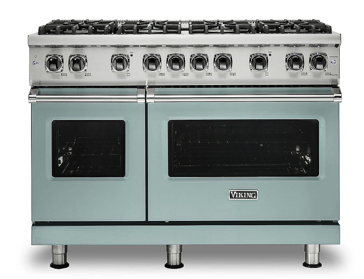 The brand Viking VGR5488BSP is a flagship 48-inch freestanding gas range finished in striking Splash color. It offers eight sealed brass burners including a high‑output TruPowerPlus™ 18,500 BTU burner, VariSimmer™ on all burners, a dual oven totaling 6.1 cu ft with ProFlow™ convection, continuous cast‑iron grates, SureSpark™ ignition, and halogen lighting—built to deliver restaurant-quality heat and control. :contentReference[oaicite:2]{index=2}