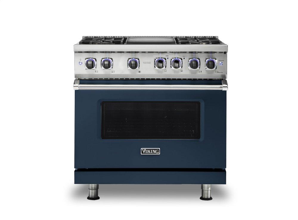 The brand Viking VGR73624GSB delivers commercial-grade capabilities in a compact 36‑inch format. It features six sealed burners and continuous cast‑iron grates for smooth transitions between cookware, along with a central 12‑inch griddle for flat-top cooking. The 5.1 cu ft convection oven includes ProFlow™ airflow and Gourmet‑Glo™ infrared broiler, ensuring even baking and searing. Professional touches like SureSpark™ ignition, TruGlide™ full-extension racks, GentleClose™ door, and SoftLit™ LED knob lighting combine for performance and durability in streamlined stainless steel.