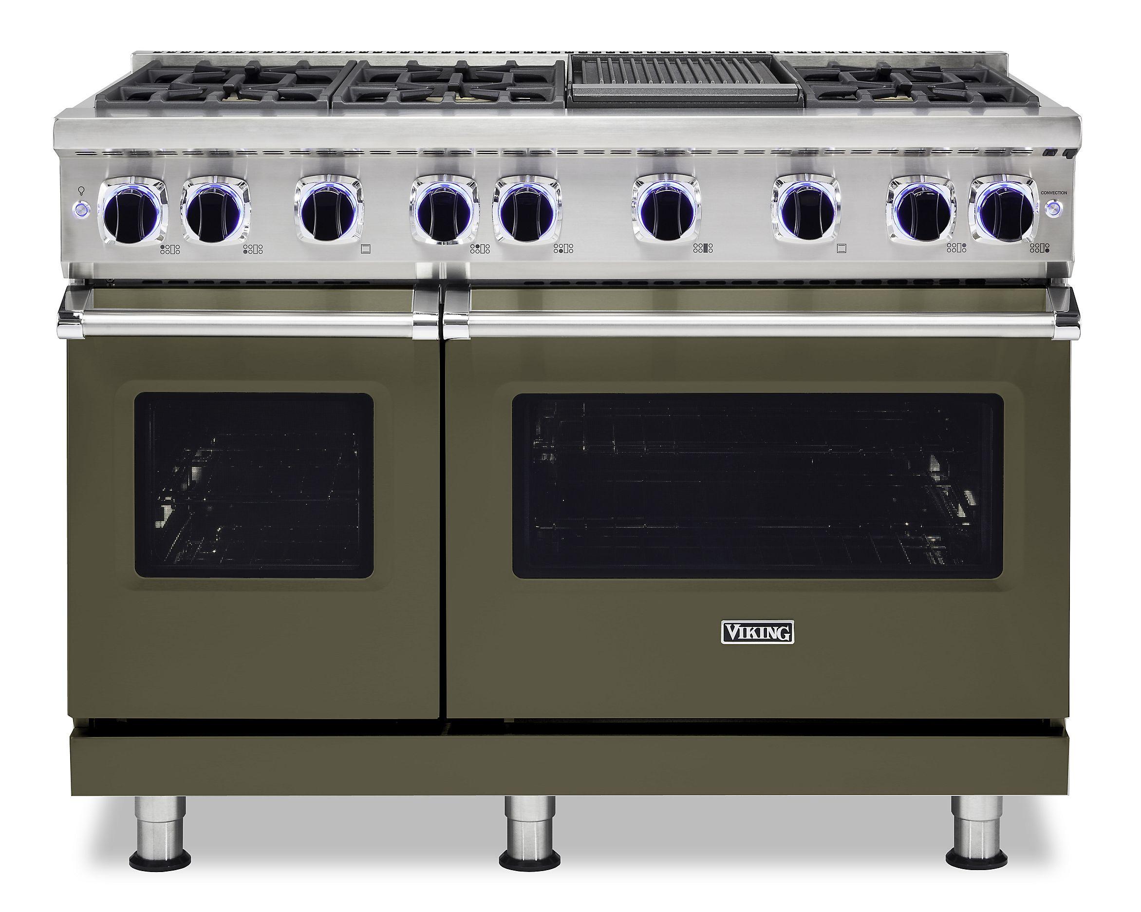 The brand Viking VGR74826GMALP range delivers restaurant-level cooking capability in a full-featured 48 inch freestanding design. With six high-output Elevation™ sealed burners (two 23,000 BTU front burners, multiple 15,000 BTU mid burners, and an 8,000 BTU simmer burner), all with VariSimmer™ settings, you gain precise temperature control. An integrated 15,000 BTU griddle adds versatility for breakfast, sandwiches, and more. The 5.1 cu ft convection oven, equipped with a rear burner, ProFlow™ convection baffle, and Gourmet-Glo™ infrared broiler, ensures even cooking and exceptional results. Additional premium touches include SureSpark™ ignition, CoolLit™ BlackChrome™ knobs, continuous cast-iron grates, GentleClose™ oven door, and TruGlide™ full-extension racks, combining commercial-quality features with home kitchen refinement. :contentReference[oaicite:0]{index=0}