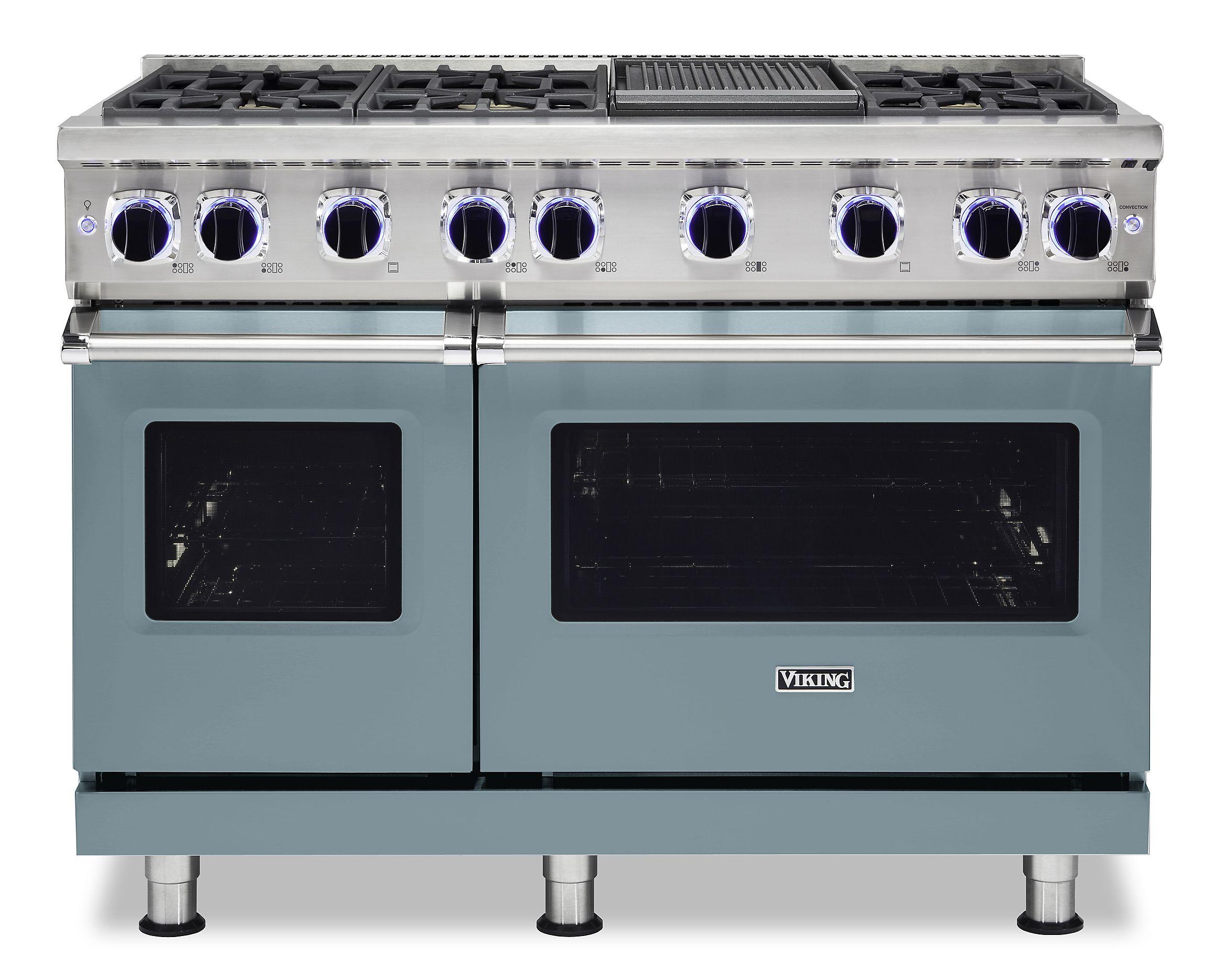 The Viking VGR74826GNSLP 48 Inch Freestanding Gas Range is engineered for serious home chefs seeking professional-level results. This high-performance appliance includes six sealed burners and an integrated 18,500 BTU thermostatically controlled Griddle, allowing for versatile cooking from boiling to searing and griddling. It features a double oven configuration with convection cooking in the larger 4.0 cu. ft. oven and a secondary 2.1 cu. ft. oven for additional baking capacity. The VSH™ Pro Sealed Burner System and VariSimmer™ setting provide precision heat control, while the automatic ignition/re-ignition system adds safety and ease of use. Finished in stainless steel with heavy-duty components, this LP-configured gas range offers the power, flexibility, and style ideal for gourmet home kitchens.