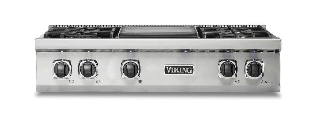 The brand Viking VRT5364GSS is a premium 36‑inch 5 Series gas rangetop built to perform in gourmet kitchens. Equipped with the exclusive VSH™ Pro Sealed Burner System, it delivers precise heat control with three 15,000 BTU burners and a powerful front TruPower Plus™ 18,500 BTU burner, all featuring VariSimmer™ settings for gentle low‑heat cooking. The 12‑inch griddle offers flat‑top versatility with a removable grease trough, while the porcelainized one‑piece cooking surface with raised edges contains spills for easy cleanup. Additional pro features include SureSpark™ ignition with automatic re‑ignition, SoftLit™ LED control lights, durable stainless‑steel knobs, and included island trim—making it a professional-grade centerpiece in any custom kitchen.