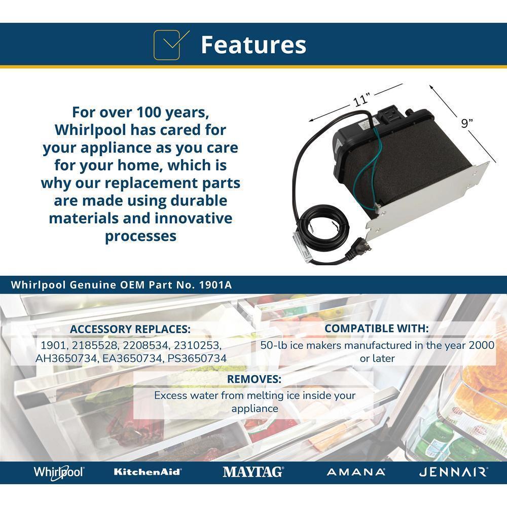 The Ice Machine Drain Pump Kit helps remove excess water from melting ice inside your appliance. This is an accessory that can be used with most 50-lb ice makers manufactured in the year 2000 or later; check to see if your model number is compatible. This pump is designed to purge excess water up to 10'H. Replacing this accessory will require basic hand tools, some disassembly of the ice machine and novice repair experience. You must unplug the ice machine or shut off the house circuit breaker for the appliance before installing this part. Also make sure you turn off the water supply before you begin. Helpful Tip: We also recommend using affresh(R) Ice Machine Cleaner* (item W11179302) to help reduce mineral deposits that can clog your appliance and affect its performance. *affresh(R) brand products are owned and distributed by Whirlpool Corporation.
