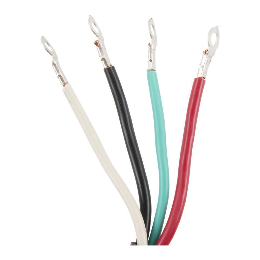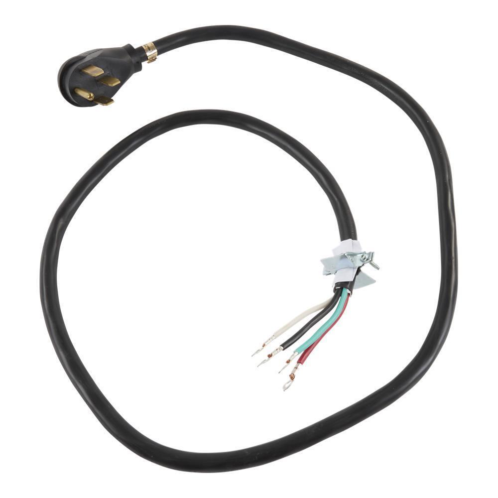 This Electric Range Power Cord is a UL-listed accessory that measures 6" L and features a 4-prong, 40-amp design with an adjustable strain relief bracket. The cord has ring terminal connectors that ensure a safe connection and a right-angle plug to save space. Check to see if your model number is compatible. Installing this accessory will require basic hand tools, but no disassembly of the dryer or repair experience. Make sure you shut off the house circuit breaker for the appliance before installing this part.