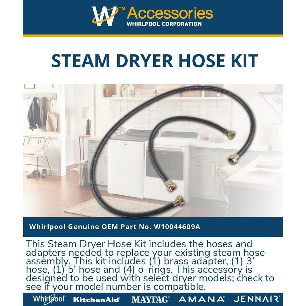 This Steam Dryer Hose Kit includes the hoses and adapters needed to replace your existing steam hose assembly. This kit includes (1) brass adapter, (1) 3' hose, (1) 5' hose and (4) o-rings. This accessory is designed to be used with select dryer models; check to see if your model number is compatible. Replacing this accessory will require basic hand tools, some disassembly of the appliance and novice repair experience. You must unplug the dryer or shut off the house circuit breaker for the appliance before installing this accessory. Also make sure you turn off the water supply.