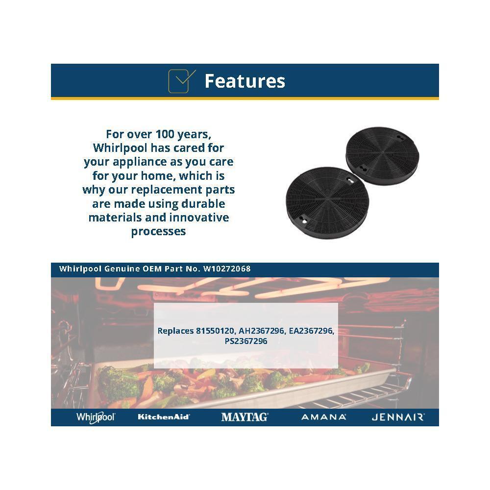 This set of two Range Hood Charcoal Filters traps grease from the exhaust air of your oven to help prevent it from entering the blower and vent, potentially causing build-up and damage. If your current filter is no longer functioning properly, you should replace it promptly with this item. This charcoal filter is a universal accessory that can be used across several brands; check to see if your model number is compatible. Size of each filter: 7-5/8" diameter by 7/8" thick. Installing this accessory will require basic hand tools, some disassembly of the range hood and novice repair experience. Helpful Tip: Replace your range hood s filter every 6 months to maximize performance and efficiency.
