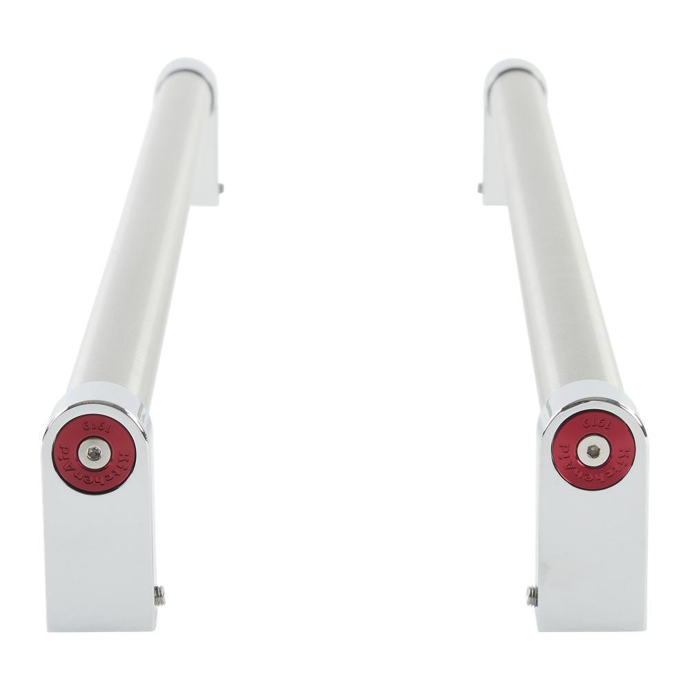 This KitchenAid Refrigerator Handle Kit in stainless steel allows you to create a custom look for your under-counter refrigerator door and contains (2) refrigerator door handles, and all hardware required for installation. The sturdy bar handle shape, sleek chrome caps, and easy-to-clean satin cross-hatch texture combine high style with a secure grip. The handles feature red medallions and are designed to be installed on select KitchenAid(R) double drawer beverage centers, including models KUDF204EPA and KUDR204EPA; check to see if your model number is compatible. Installing this accessory will require basic hand tools and novice installation experience. You must unplug the appliance or shut off the house circuit breaker before installing this accessory.