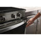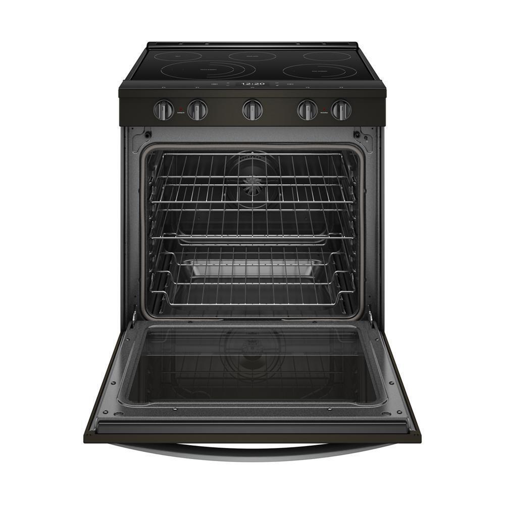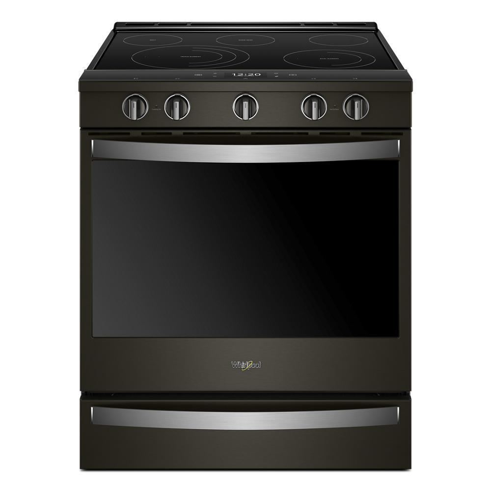 The Whirlpool WEE750H0HV is a 30-inch slide-in electric range finished in sleek Fingerprint Resistant Black Stainless Steel, designed to seamlessly integrate into your kitchen. It boasts a spacious 6.4 cu. ft. True Convection oven that ensures even baking results. The 5-element ceramic glass cooktop includes a FlexHeat™ triple radiant element accommodating various cookware sizes. Advanced features like Scan-to-Cook technology allow you to send customized cooking instructions from your smartphone, while Air Fry Mode provides healthier cooking options. The intuitive touchscreen learns and adapts to your cooking routines, and voice control capabilities offer hands-free operation. Additional conveniences include Frozen Bake™ technology for skipping preheating, Rapid Preheat for faster cooking, and a storage drawer for keeping cookware organized.