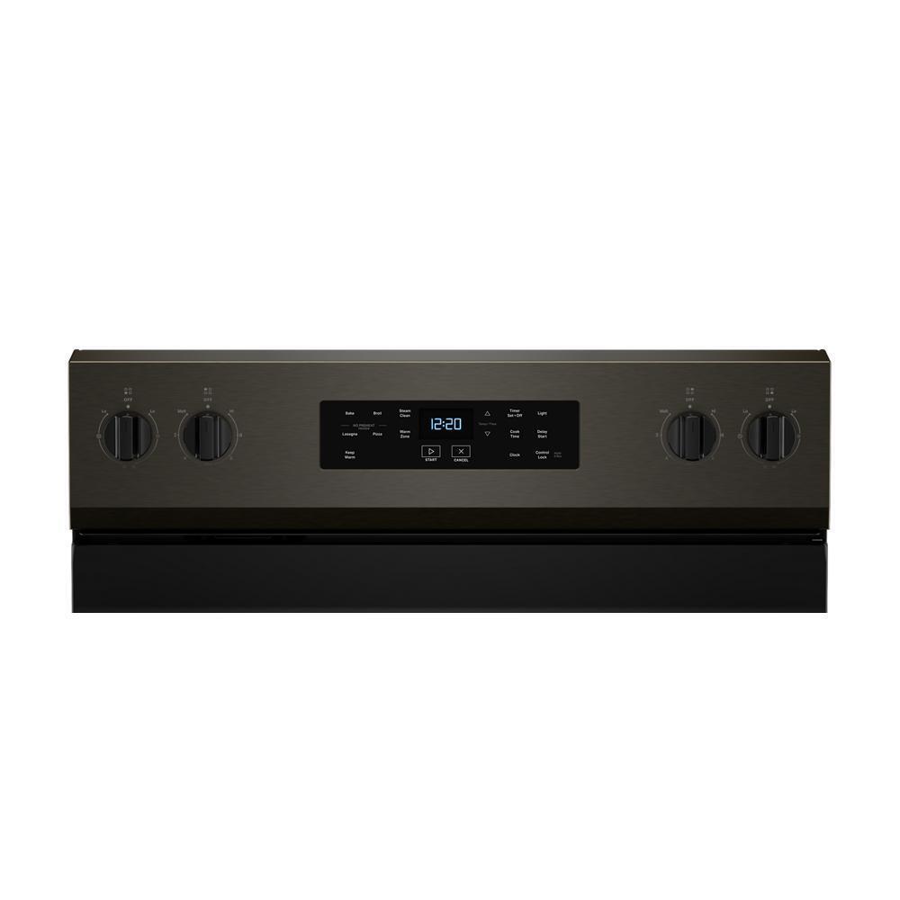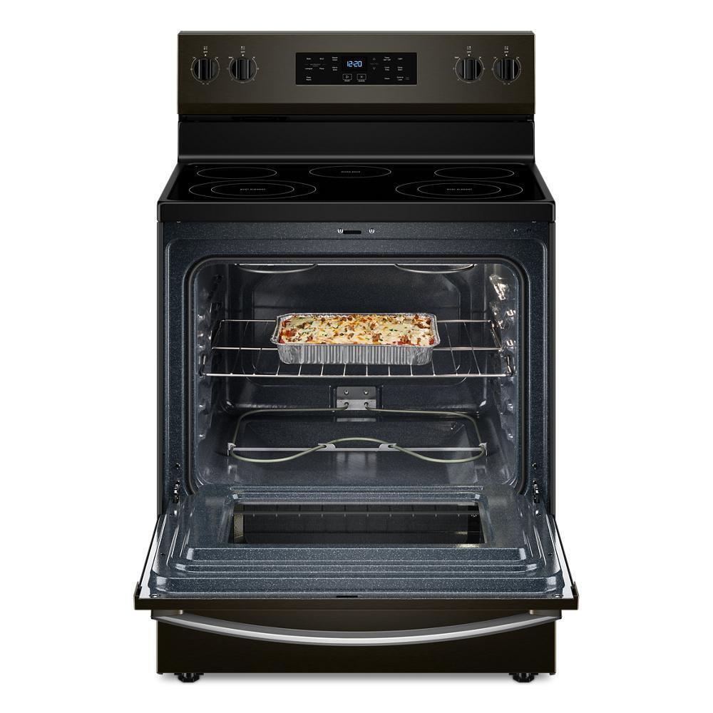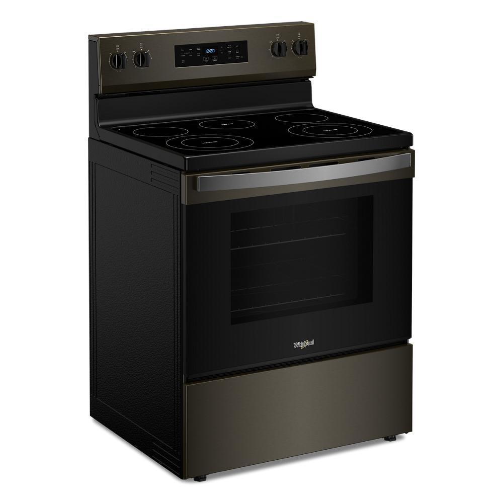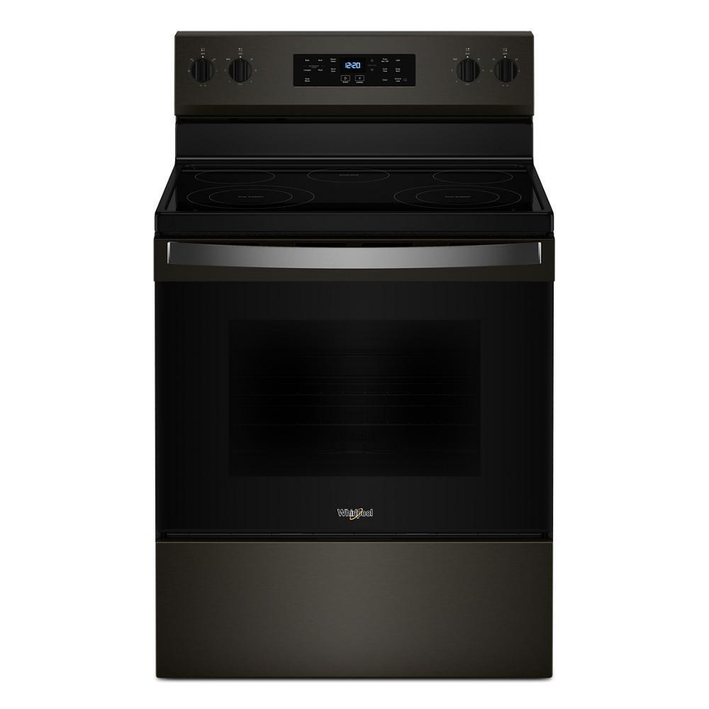 The Whirlpool WFES3330RV 30" Electric Range includes Frozen Bake™ technology, radiant cooktop, and a 5.3 cu. ft. oven in a modern Black Stainless finish that enhances any kitchen aesthetic.