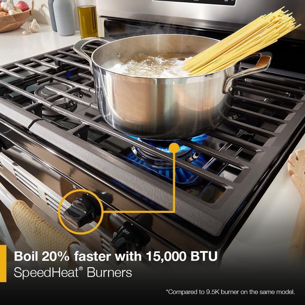 Use the SpeedHeat(TM) Burner to boil 20% faster* with high heat, so you can get dinner to the table quickly. *Compared to 9.5K burner on the same model.