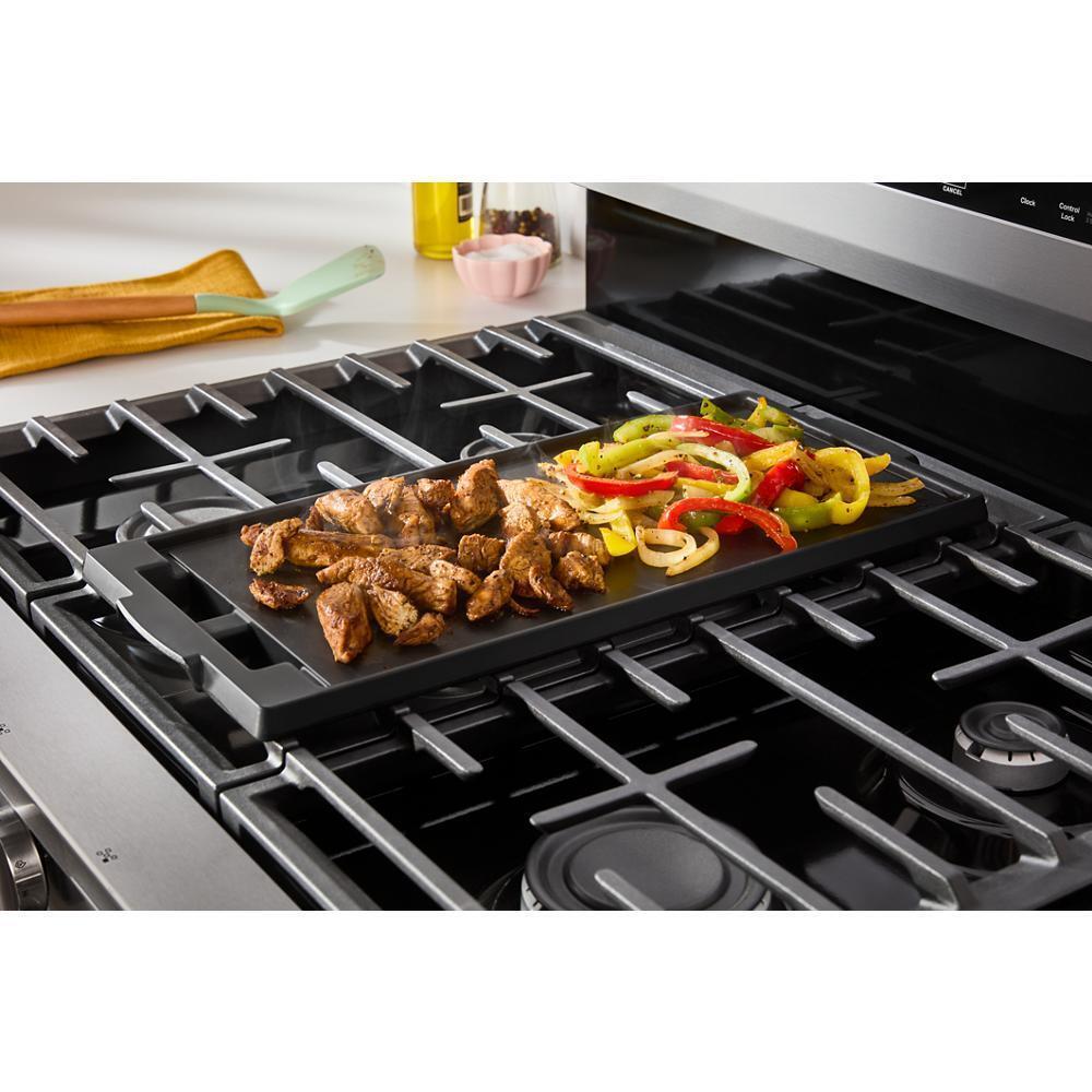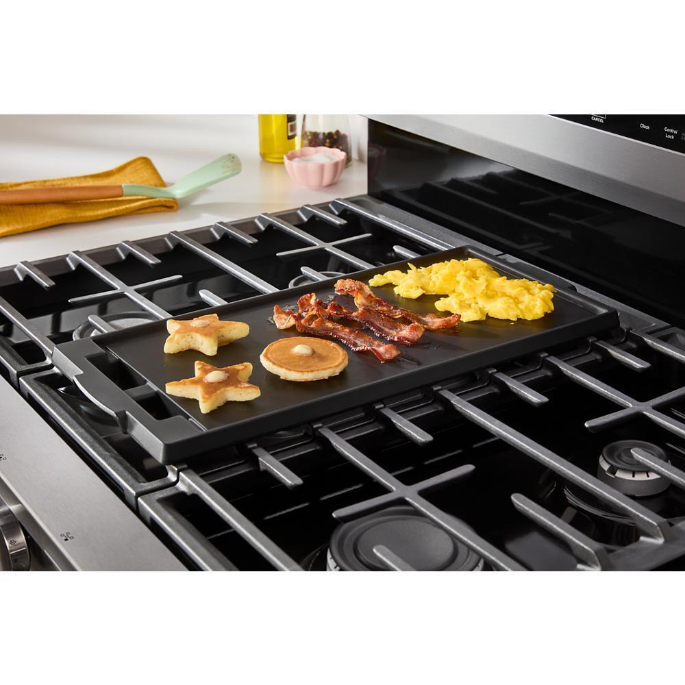 The Whirlpool WFGS5030RS combines professional-level performance and modern convenience in a sleek stainless steel design. The inclusion of Air Cooking Technology ensures consistent airflow and even heating across the spacious 5.0 cu. ft. oven capacity, ideal for baking, roasting, and multi-dish cooking. Equipped with 5 sealed burners, including a powerful 17,000 BTU SpeedHeat™ Burner, it offers rapid boiling and precise simmering. The robust Edge-to-Edge Cast Iron Grates provide a stable surface for multiple cookware pieces, while Dishwasher-Safe Grates simplify cleanup. Enhanced features such as Electronic Touch Controls and Control Lock Mode promote user convenience and safety. A large viewing window allows for visual monitoring without disturbing the cooking process, and the bottom storage drawer keeps pots and pans neatly organized.