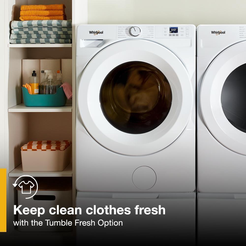 Keep clothes fresh until they're ready for the dryer using the Tumble Fresh Option on this ENERGY STAR(R) Certified front load washer. Choose from 12 different cycles, including the Quick Wash Cycle to wash a full 10-lb load in only 25min. Or the Cold Wash Cycle to help protect fabric and save energy.