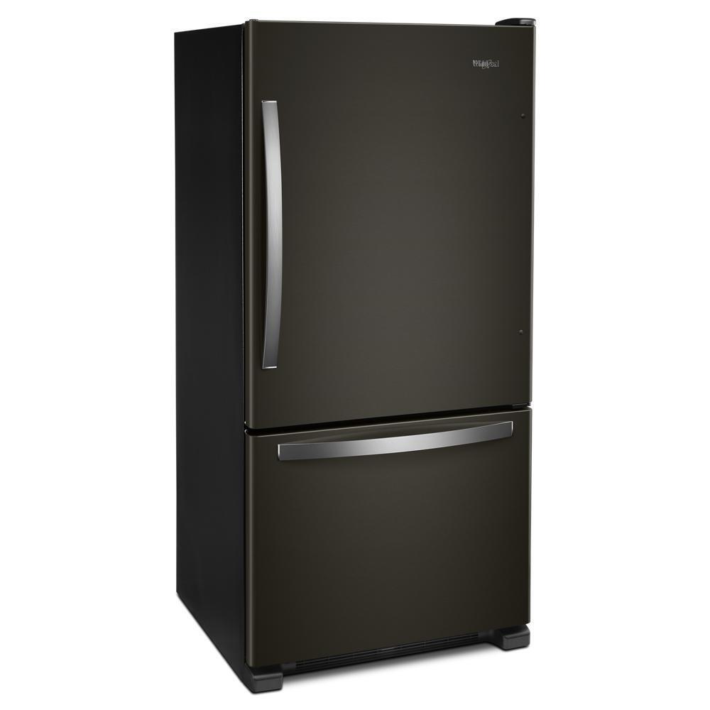 The Whirlpool WRB322DMHV 33" Bottom-Freezer Refrigerator features 22 cu. ft. of storage, SpillGuard™ glass shelves, and Accu-Chill™ temperature management in a Black Stainless Steel finish.
