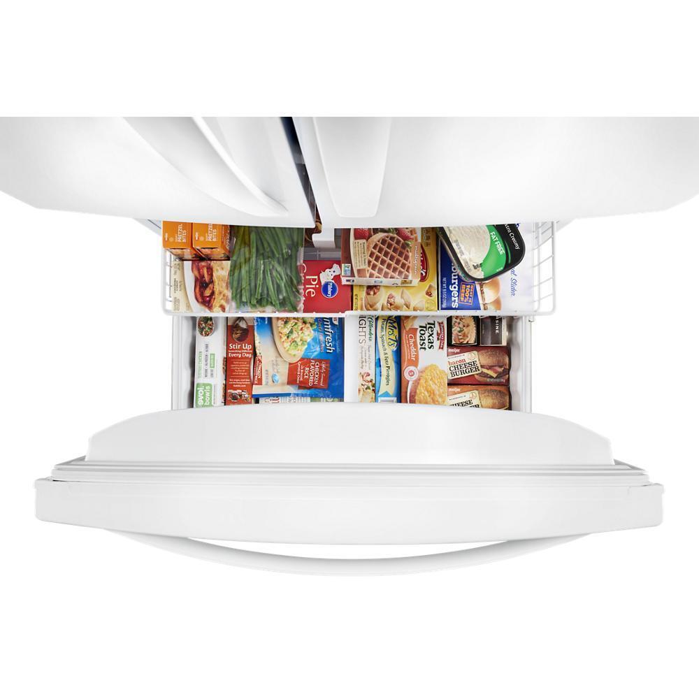 33‑inch French door refrigerator in clean White finish, featuring 25 cu ft capacity, adaptive intelligence controls, and external water and ice dispenser — for smart and spacious kitchen storage.