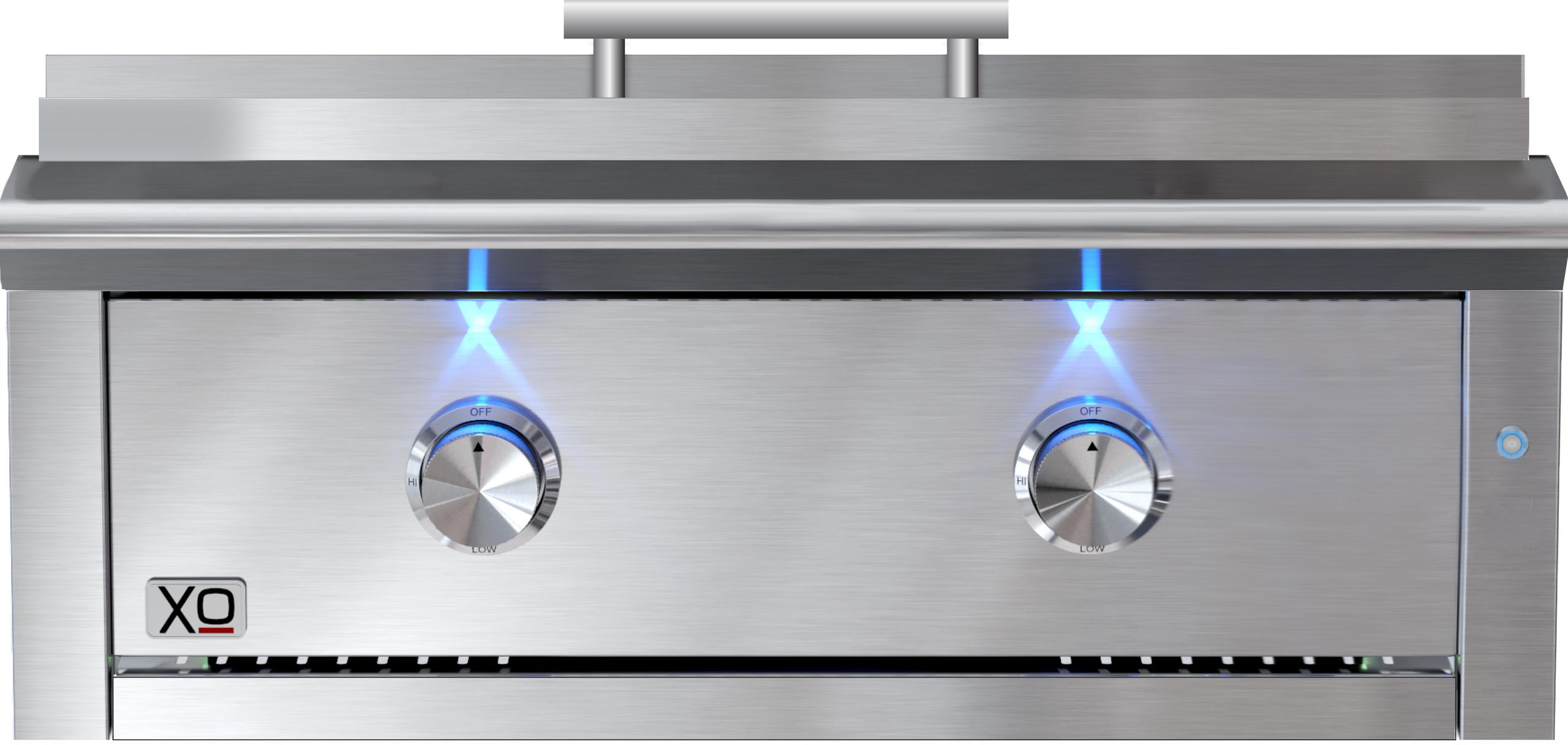 The amazing versatility of the XO Pro-Grade luxury griddle allows you to cook up dishes not possible on your ordinary grill. Sizzling fajitas, fried rice, caramelized onions, smashed burgers and veggies for the whole family. Features signature LED control knob illumination. The XO Pro-Grade built-in griddle is equipped with two commercial quality, 304 stainless steel U-shaped burners that each deliver 18,000 BTUs of cooking power for a total of 36,000 BTUs across the 495 square inch stainless steel cooking surface.